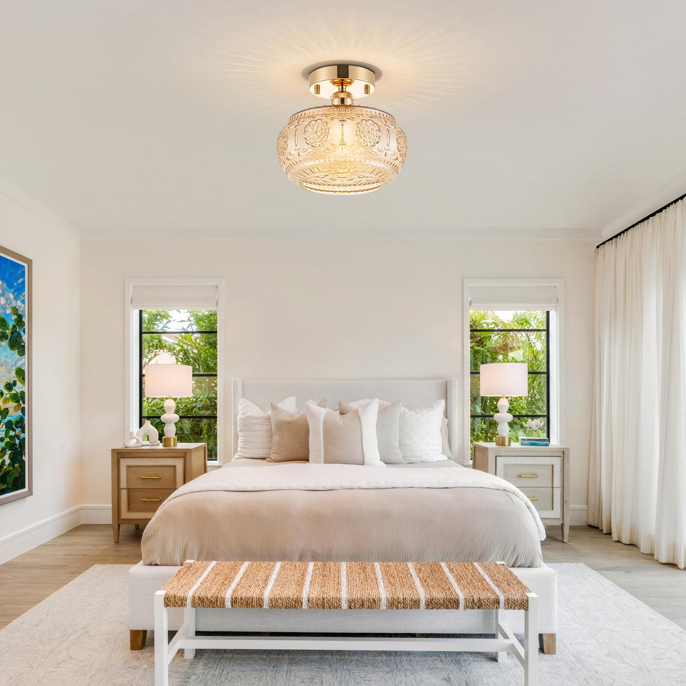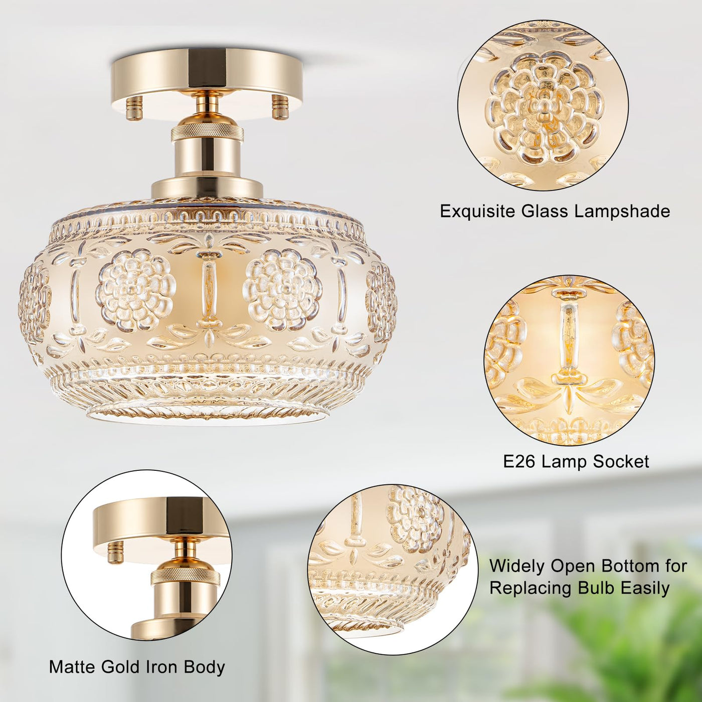 Elevate Your Space With Artisanal Brilliance Introducing Our unique design Semi Flush Mount Ceiling Light Where The Decadence Of French Gold Electroplating Meets The Amber Warmth Of A Hand-Blown Floral Glass Shade. Every Curve Of The Vintage-Inspired Brass Base Reflects Artisanal Craftsmanship While The Amber-Tinted Glass Bathes Rooms In A Sun-Kissed Glow. Perfect Fusion Of Form & Function Measuring 9.38 X 9.38 X 8.66 This Semi Flush Mount Fixture Is Engineered For Spaces Craving Elegance Without Clutter. Ideal As A Bathroom Ceiling Light (Humidity-Resistant) Kitchen Lighting Centerpiece Or Bedroom Ambiance Enhancer. The Removable Shade Accommodates Any E26 Bulb (Max 60W) - Energize Mornings With Bright Leds Or Unwind With Soft Incandescents. Why Designers Adore This Piece: ?? French Gold Finish: Scratch-Resistant Electroplating That Defies Tarnishing. ?? Amber Glass Magic: Amplifies Bulb Light Into A Cozy Museum-Grade Radiance. ?? Floral Shadow Play: Unique Patterns Dance On Walls When Illuminated. ?? Effortless Care: Non-Porous Glass Repels Dust And Grease Splatters. Risk-Free Investment Your Satisfaction Is Our Pledge. Every Fixture Ships In Anti-Shock Packaging Guarded By A 24-Month Warranty And 90-Day Returns. Transform Mundane Dining Rooms Hallways Or Entryways Into Galleries Of Light - Click [Add To Cart] Today!