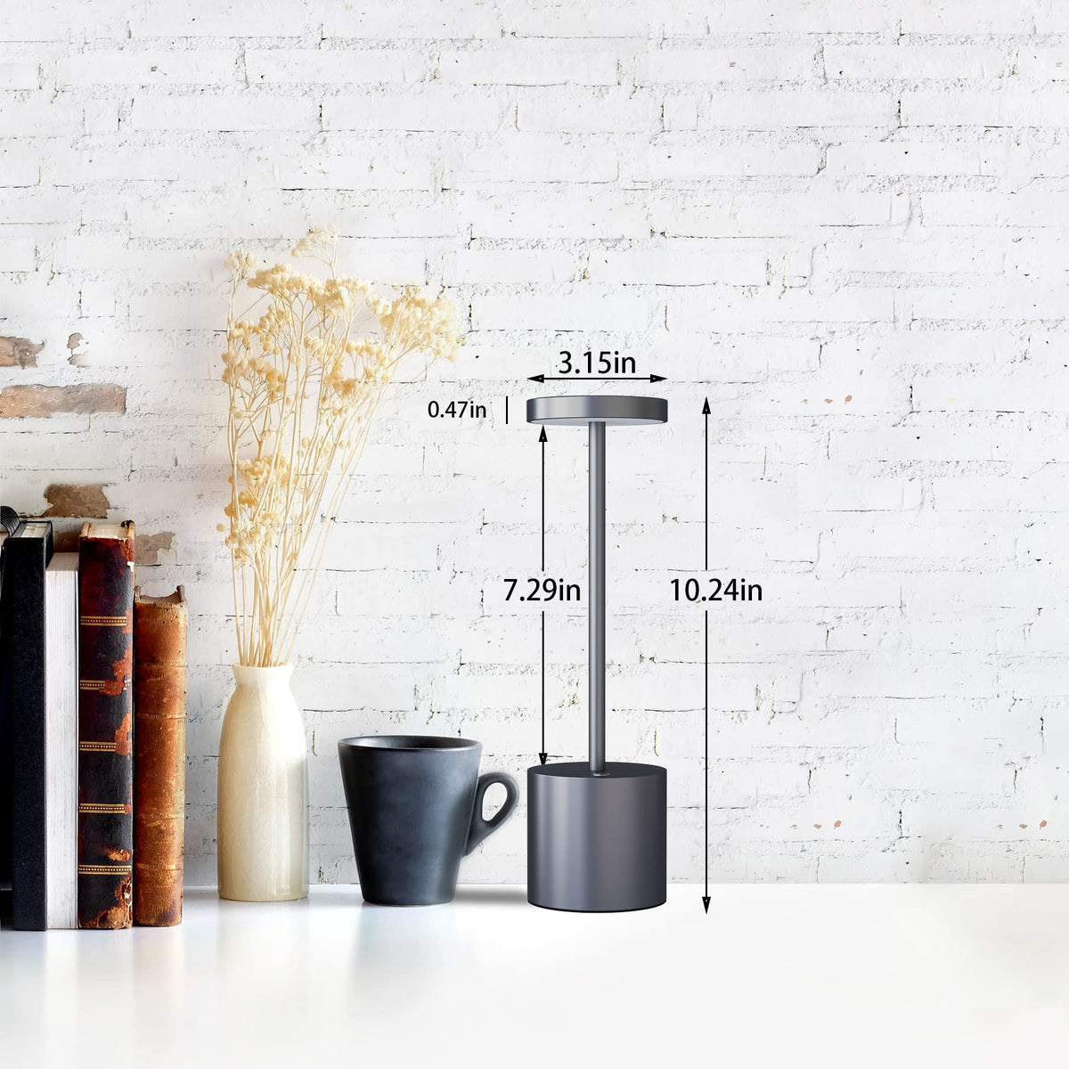 Q: What are the dimensions and weight of the LED cordless table lamp?A: The LED cordless table lamp has a diameter of 3.15 inches and a height of 10.24 inches, making it highly portable. It weighs only 1 pound, allowing for easy transportation and use in various settings.