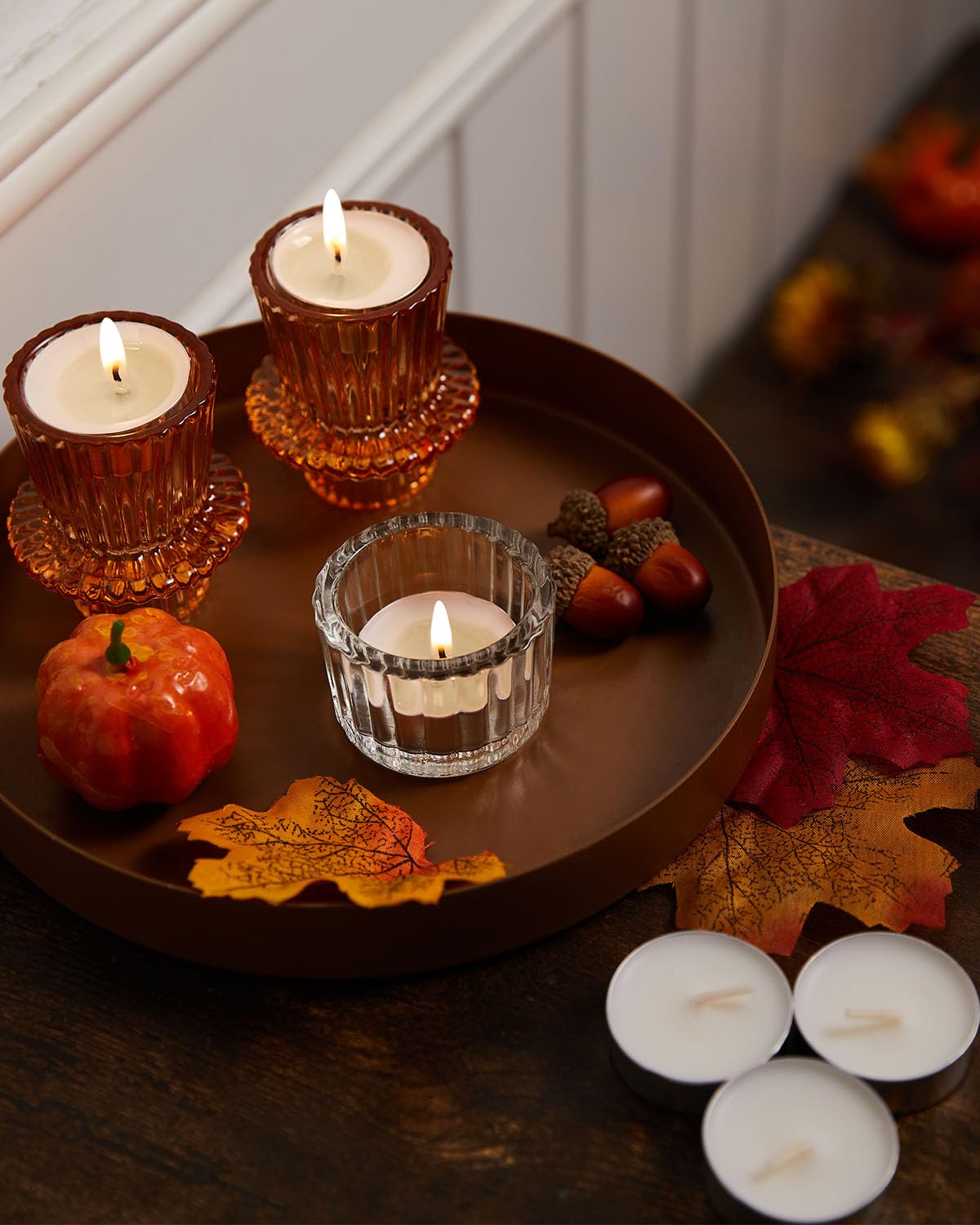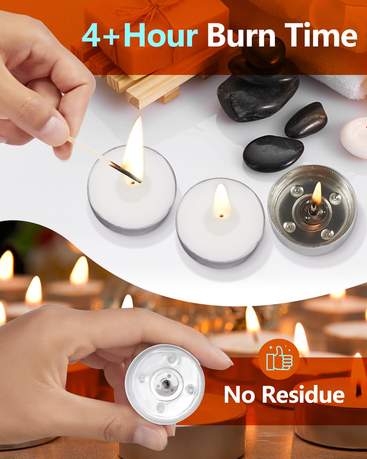 Q: How long do the Tea Lights Candles burn?A: Each tea light candle burns for up to 4.5 hours, providing a long-lasting and enjoyable ambiance for your gatherings and events.