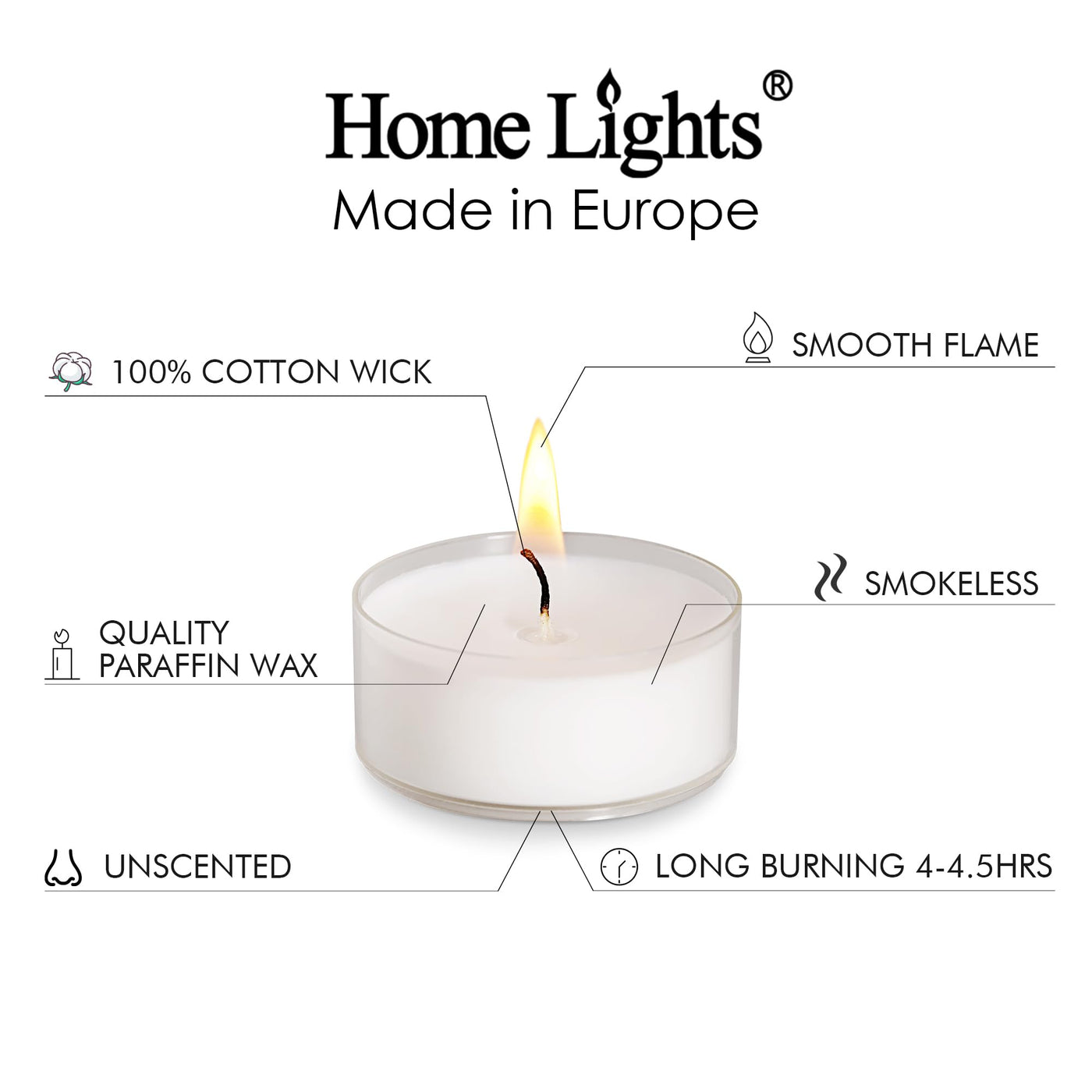 Brighten Up Your Home Décor & Spread A Welcoming Ambiance With Home Lights White Tea Light Candles! We carefully chosen paraffin wax with a cotton wick to bring you mini votive candles that brighten your décor and spread a warm glow all around, making them ideal for setting a romantic or peaceful mood. Unlike traditional candles, our tea light candles are hand poured in Europe with pure paraffin and will burn for up to 4 - 4.5 hours. They are perfect for anyone that wants to spend more time enjoying and less time replacing burned candles or cleaning wax drippings. Burn Longer & Cleaner Without Any Smoke Or Flickers Home Lights votive candles bulk are dripless, smokeless, and just right for any event or occasion. They’re perfect for weddings, parties, festivals, anniversaries and more where you want to elevate the look of your décor the elegant way. We only use 100% cotton wicks that not only burn for longer but cleaner as well. They don’t make any smoke or flicker so you can use them anywhere you want. They are light and portable so you can easily move them around the house and store when done. Features You’ll Love: - They burn bright without flickering and can be used as emergency lights as well - Each pack comes with 100 votive candles so you have plenty for any occasion - Votive candles are stackable and easy to store without taking much space - They keep burning for up to 4 - 4.5 hours without needing to be replaced - The metal holder collects all the drippings and prevents them from leaking Add A Soothing, Eye-Catching & Elegant Touch To Your Décor With Home Lights Bulk Tealight Candles