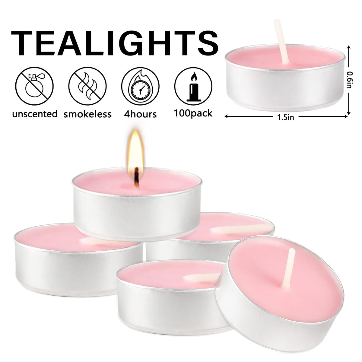 100 Pink Tealight Candles: Set of 100 bulk unscented pink tealight candles, these unscented and smokeless mini candles add a touch of cheerfulness to any environment, reducing your stress and lifting anyone's mood!