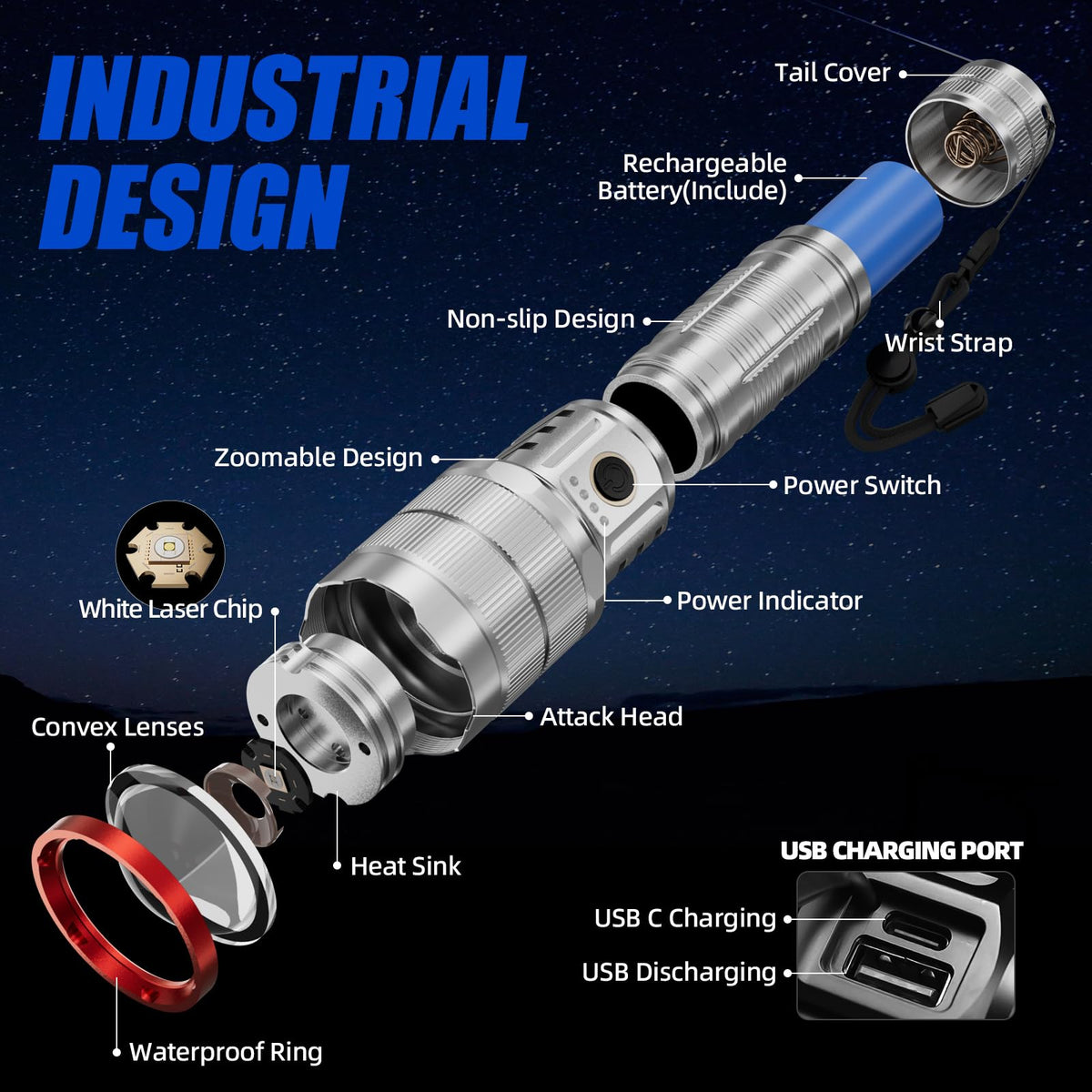 TECBOTT 900000 High Lumens Flashlights LED Rechargeable Tactical Flashlight 5 Modes Zoomable Fast Charging IPX6 Waterproof Flash Light Super Bright Handheld Flashlights for Camping Outdoor and Gift