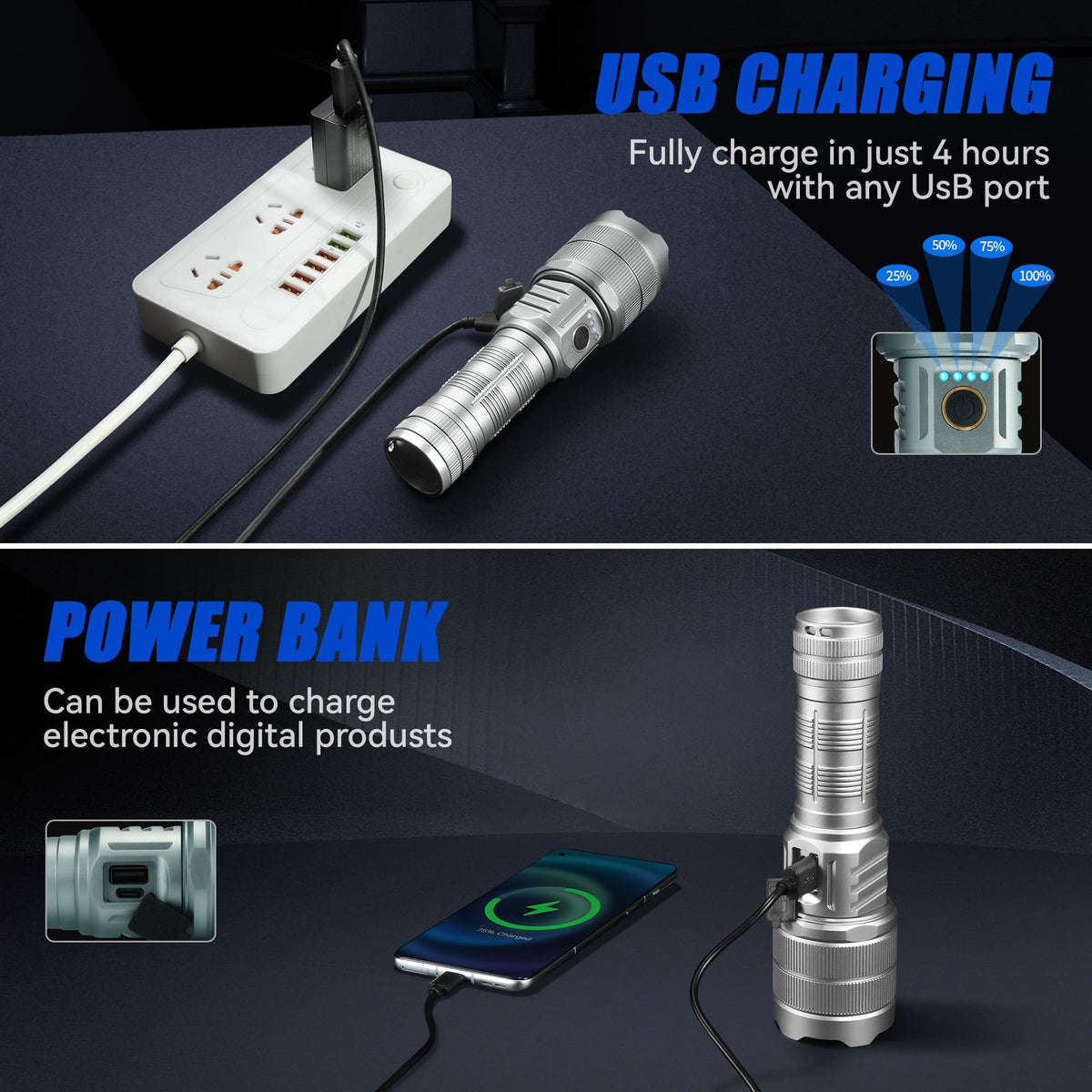 TECBOTT 10000 High Lumens Flashlights LED Rechargeable Tactical Flashlight 5 Modes Zoomable Fast Charging IPX6 Waterproof Flash