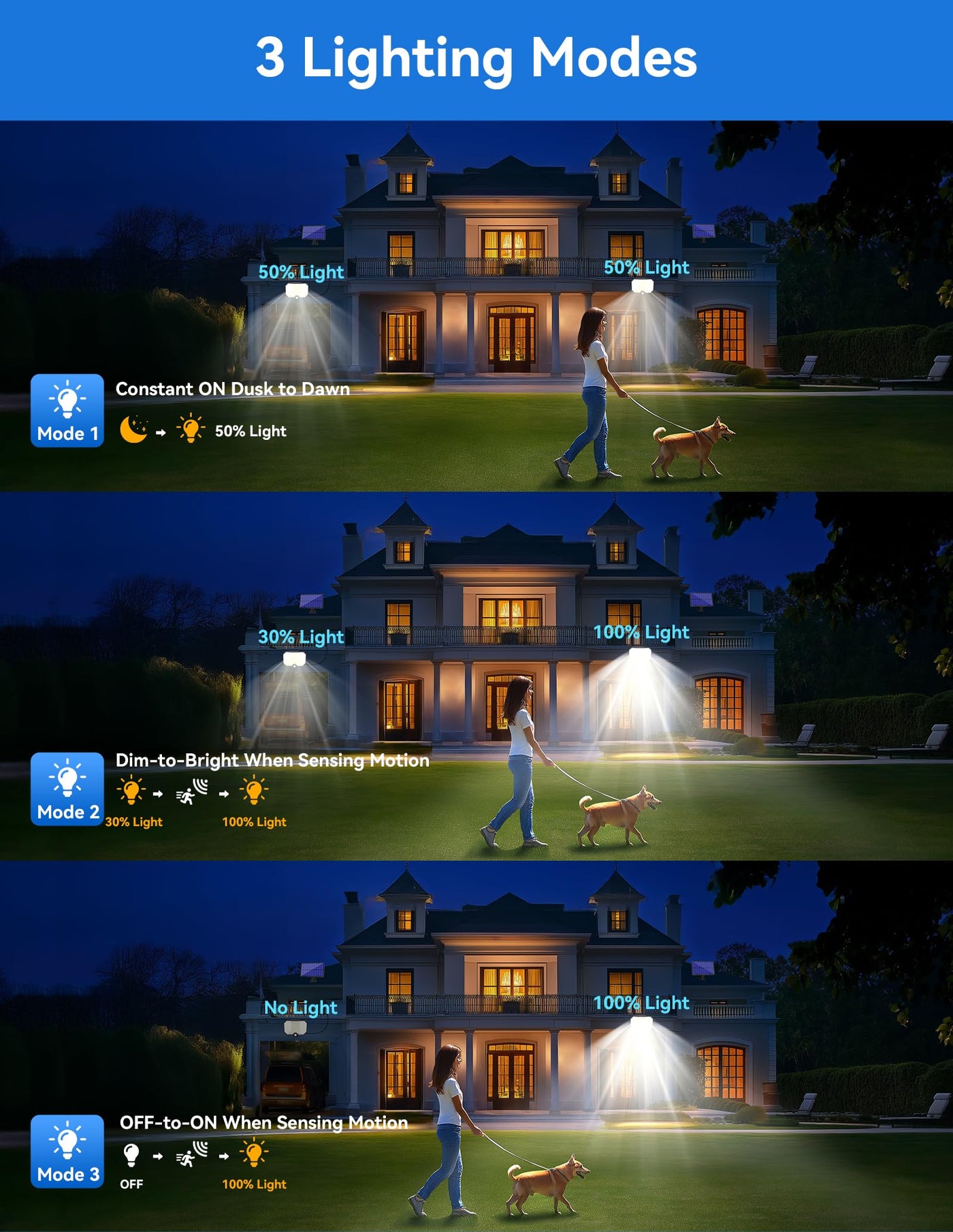 Q: What are the different modes available for the motion sensor lights?A: The motion sensor lights feature three modes: Mode 1 provides continuous light at night; Mode 2 switches to dim light when no motion is detected and brightens when motion is detected; Mode 3 activates the light for 15-25 seconds when motion is sensed, then turns off.