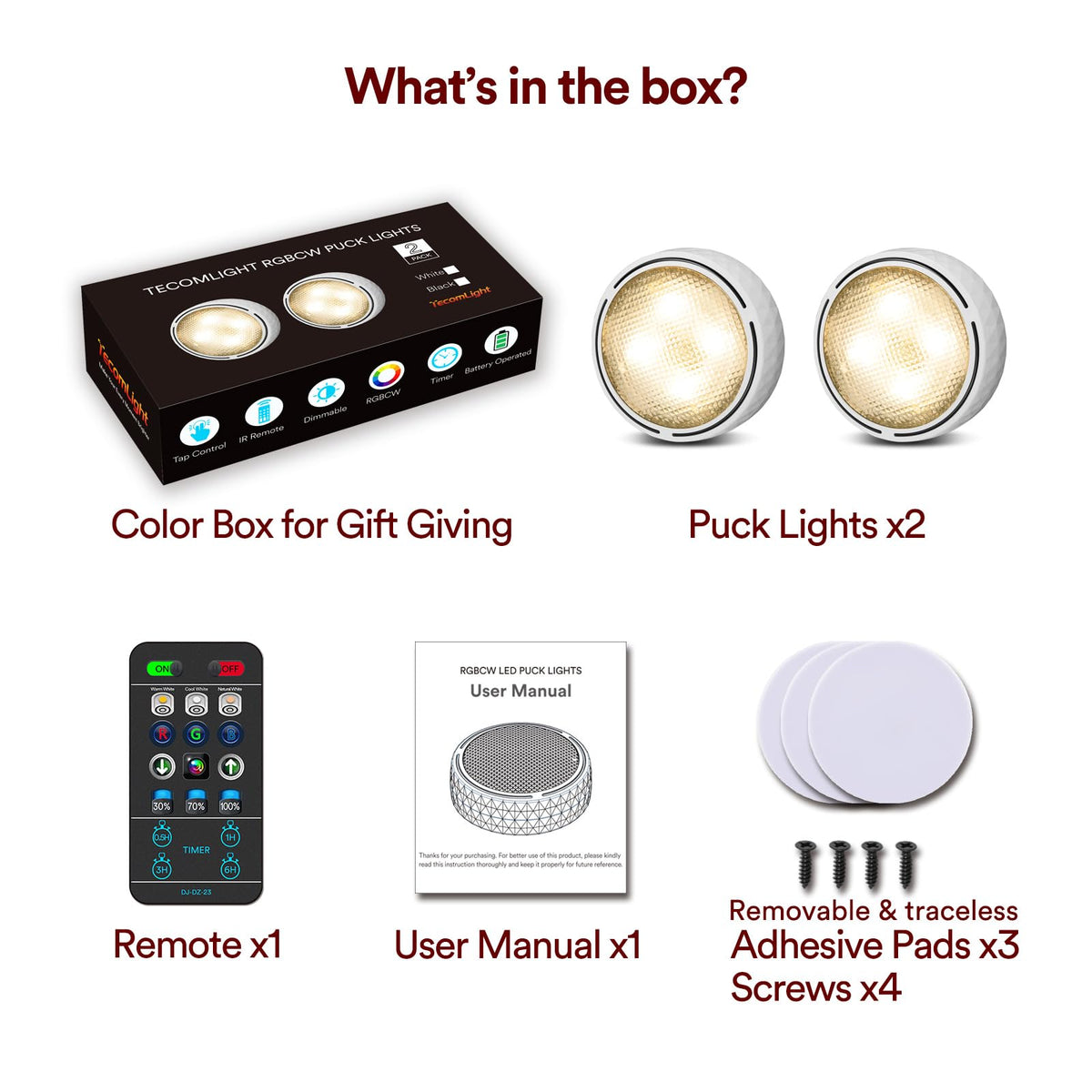 Tecomlight Led Puck Lights - Battery Operated, Wireless, Remote Control - 2 Pack - White - Under Cabinet & Closet Lighting
