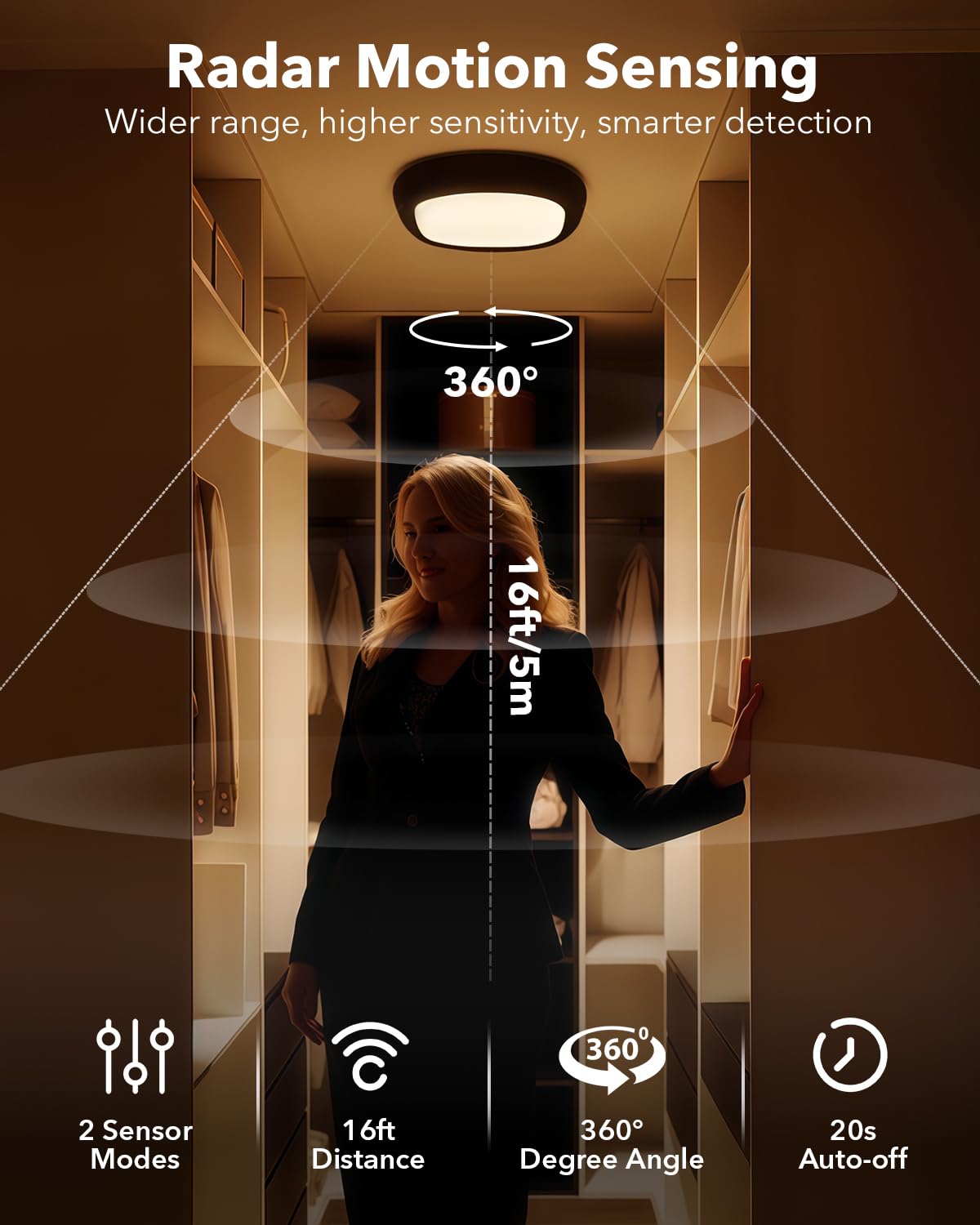 Q: What is the range of the motion sensor for the Tedmos ceiling light?A: The motion sensor of the Tedmos ceiling light can detect motion within a range of sixteen feet and a full three hundred sixty degrees, automatically turning the light on when movement is detected.