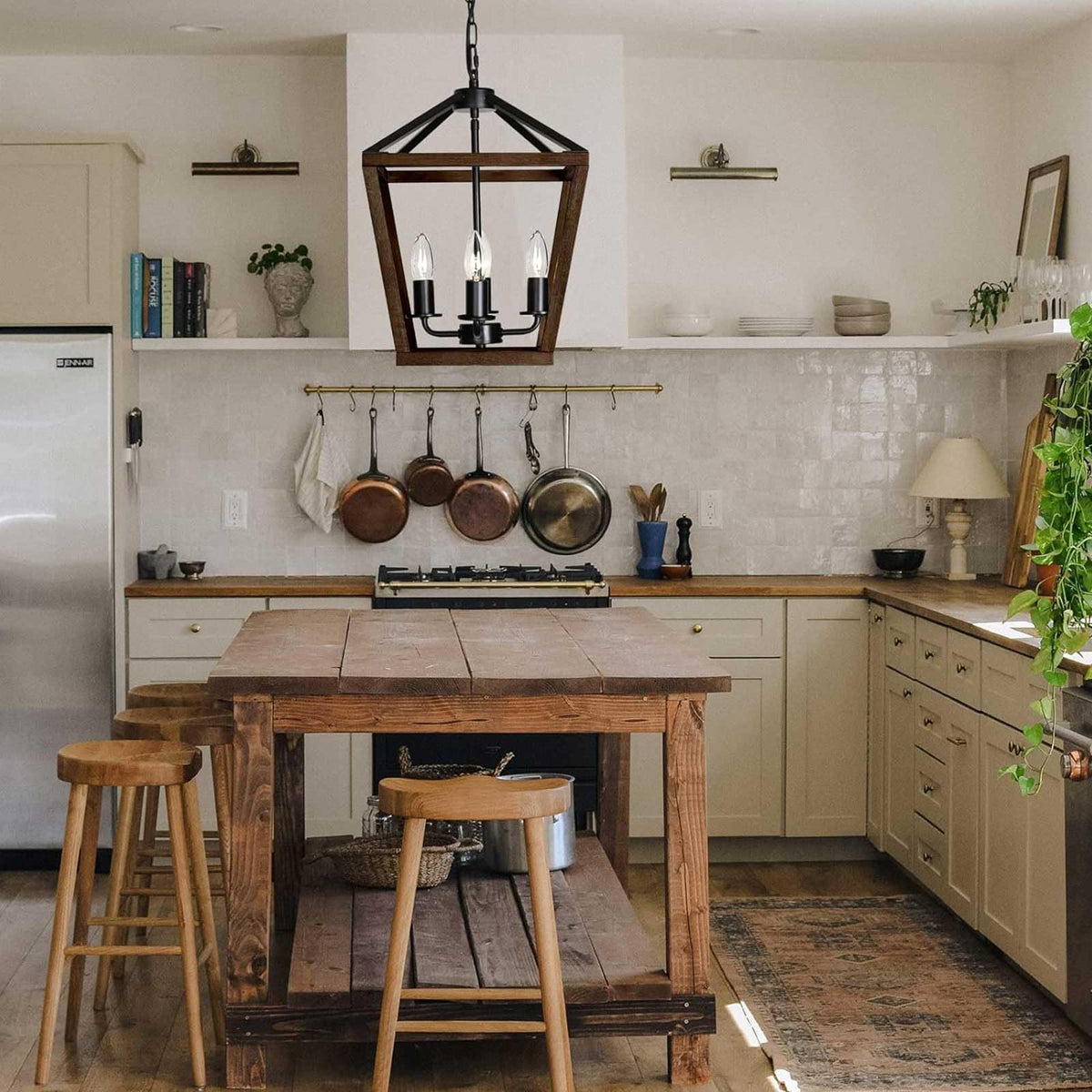 Telafly 4-Light Lantern Pendant Light,Black Wood Cage Farmhouse Chandelier For Kitchen Island,12'' Rustic Metal Geometric Hangin