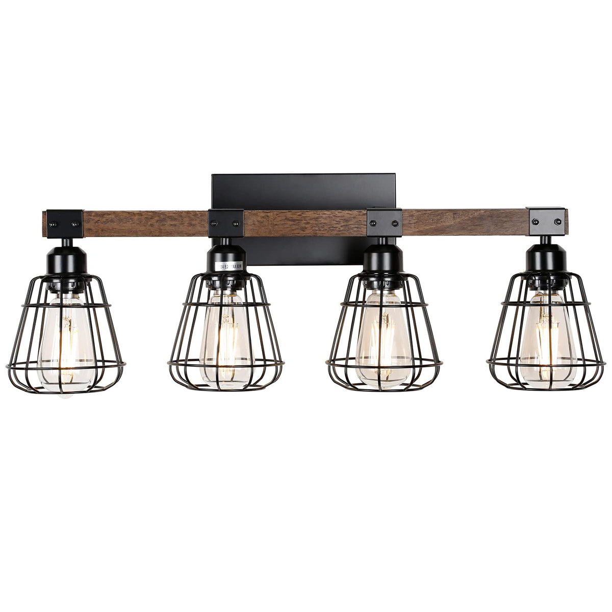 ?Farmhouse Vanity Light?4 lights rustic wood and black metal brings more farmhouse style to your life,the light passes through the modern minimalist industrial matte black cage, and the reflected light and shadow effect adds more fun to your bathroom.Good choices for home decoration! | ?High Quality material?Farmhouse wooden and matte black cage,Anti-rust and anti-oxidation.Wire with UL certification and hight quality material,more durable and safe. | ?E26 US Standard Socket?Compatible with 60-watt max E26 based bulbs.Suitable for dimmable LED,Incandescent,energy saving bulb. (bulbs are not included) | ?Wide Application?Lenth:26.4''