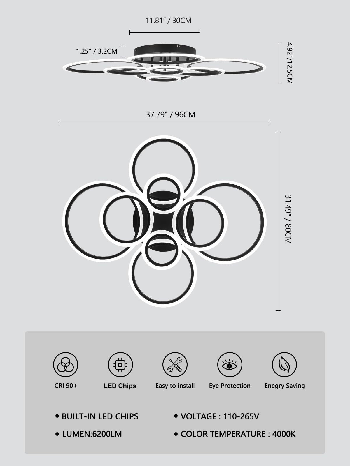 Q: What are the dimensions of the TEMINBU Modern LED Ceiling Light?A: The TEMINBU Modern LED Ceiling Light measures 37.79 inches in length, 31.49 inches in width, and 4.92 inches in height, making it a perfect fit for various spaces.