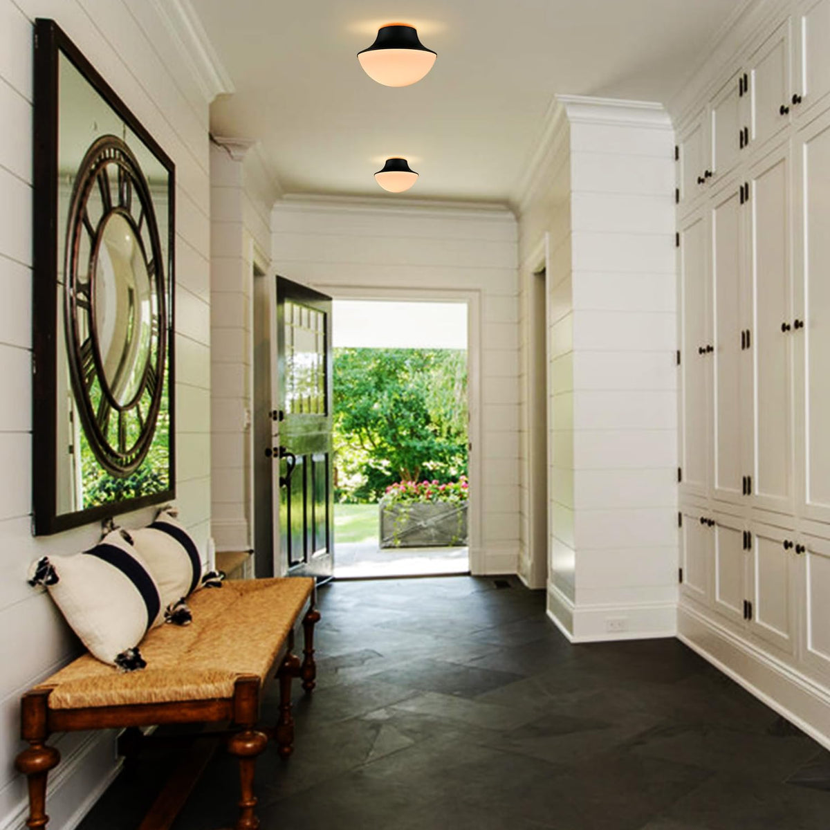 Tengiants Modern Matte Black Semi Flush Mount Ceiling Light Fixture Industrial Metal Round Bowl Shape Milk Glass Light Fixture C