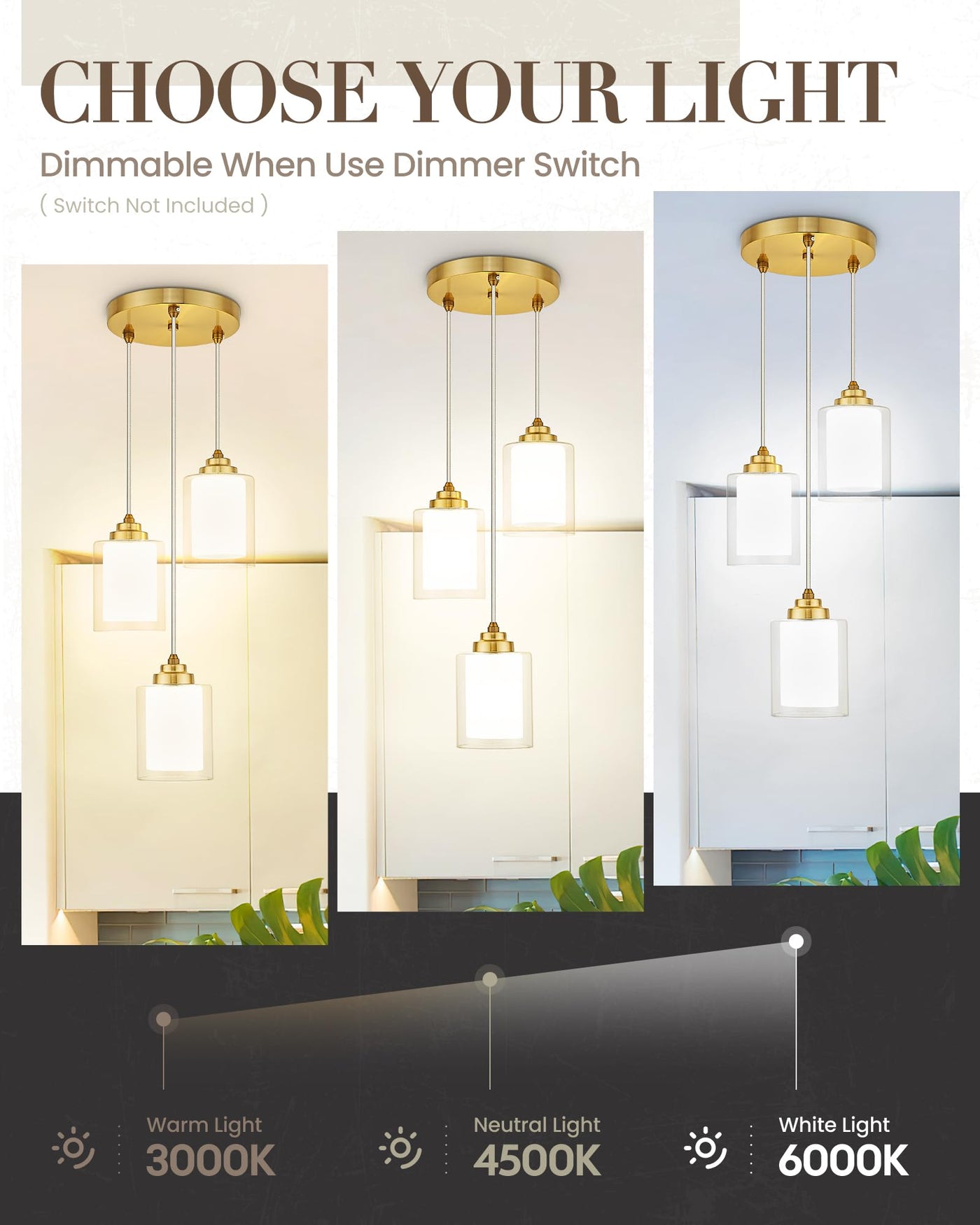 Tengxin 3 Light Pendant Light,Brushed Gold Modern Pendant Light For Kitchen Island,Dual Glass Shade,Farmhouse Pendant Lighting F