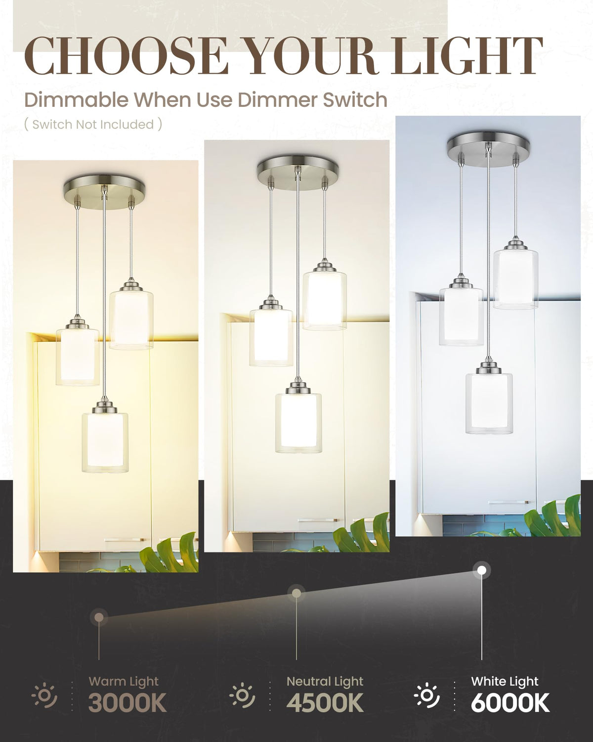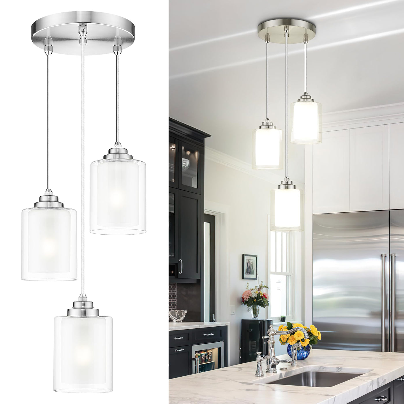 Tengxin 3 Light Pendant Light,Pendant Lights Kitchen Island,Brushed Nickel Pendant Lights With Dual Glass Shade,Farmhouse Pendan