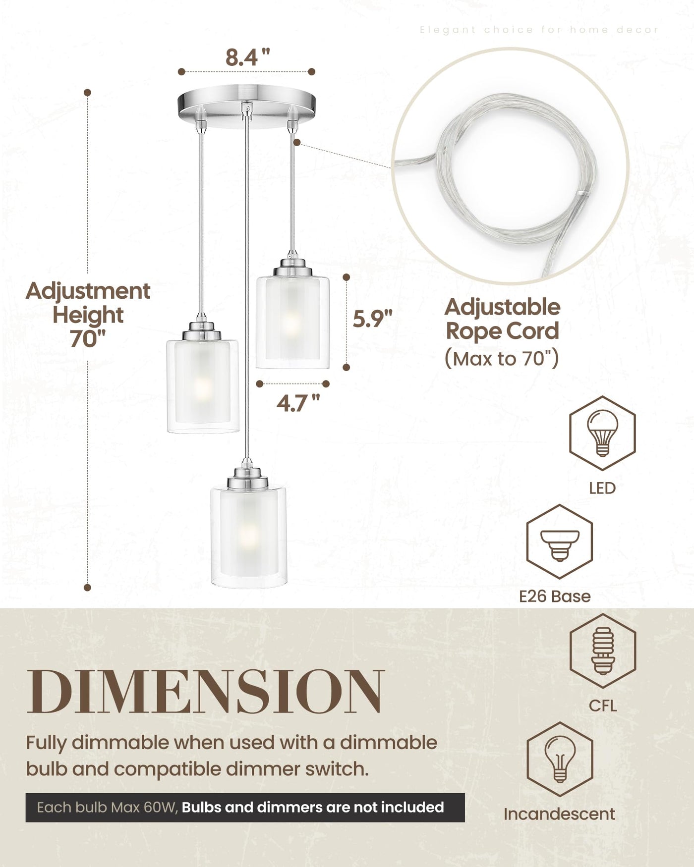 Q: Is the height adjustable for this pendant light?A: Yes, the TENGXIN pendant light comes with three equal-length cables that allow for an adjustable height of up to 70 inches, making it perfect for different ceiling heights.