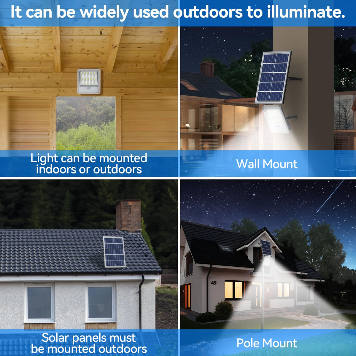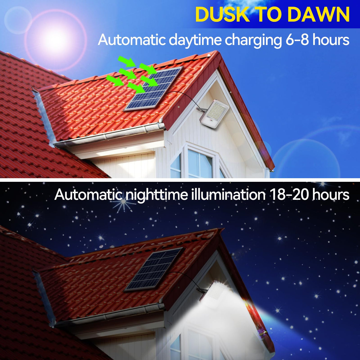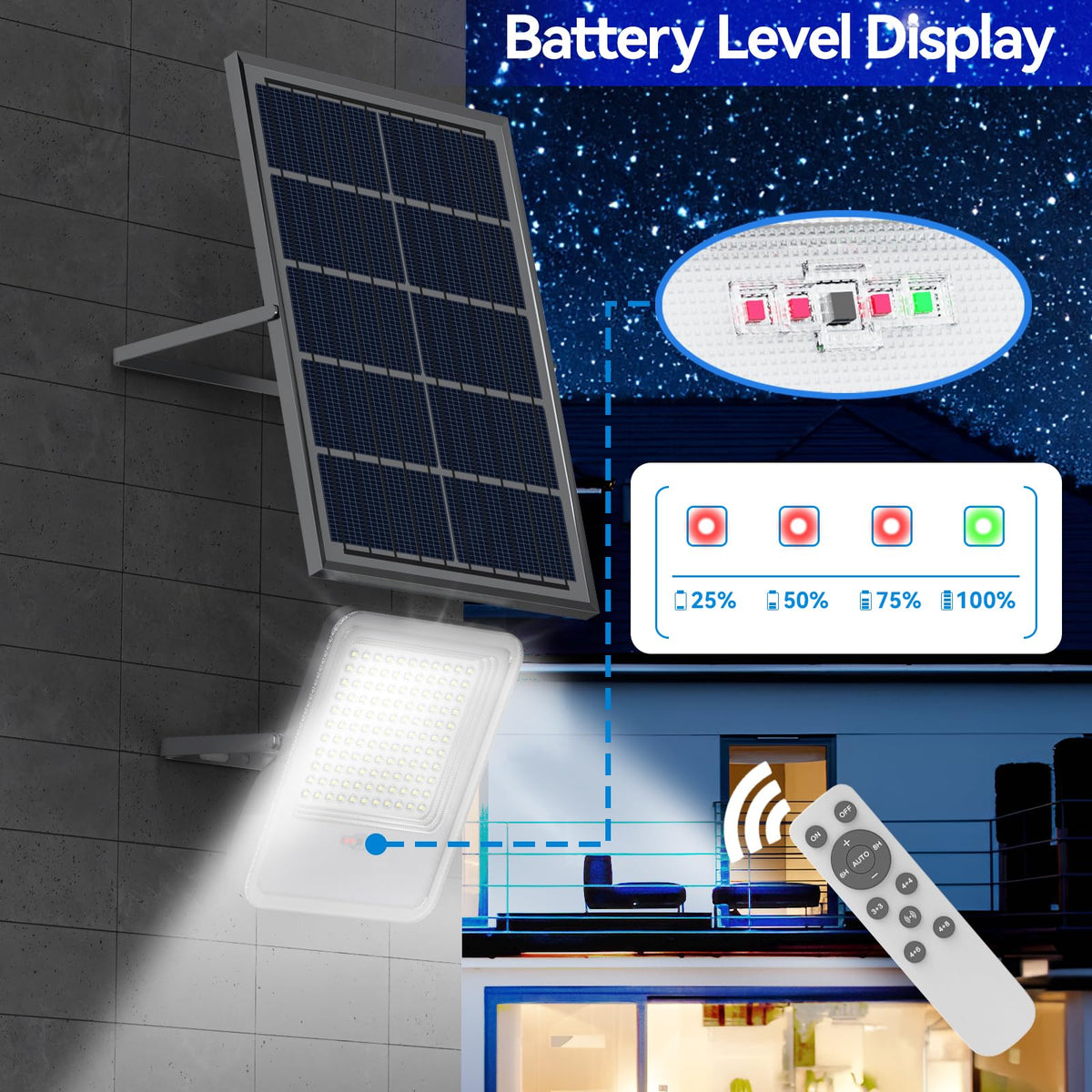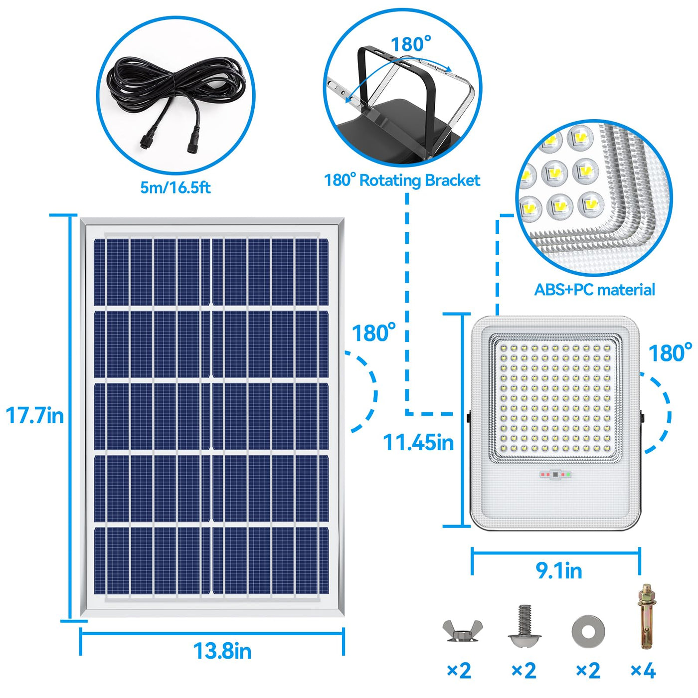 Led Solar Flood Light With Motion Sensor And Remote Control &Nbsp; Features:&Nbsp; - Carrying Motion Sensor. When The Motion Is Detected, It Is Fully Bright (100% Brightness), If No Motion Is Detected, It Returns To The Dark Mode (20% Brightness) - Light Up Automatically In The Dark And Turn Off In The Day Time Or Bright Light Condition. - Waterproof Ip67, No Pollution, Dustproof And Durability, High-Temperature Resistance And Long Lifespan&Nbsp; - Build-In Lithium Battery, No Pollution, Energy Saving, Environmental Protection And Long Lifespan. - There Are Multiple Working Modes Can Be Selected Through The Remote Control Specifications:&Nbsp; - Power Of Solar&Nbsp;Flood&Nbsp;Light: 1500W - Battery: 3.2V/60,000Mah - Solar Panel: 5V/20W - Color Temperature: 6500K/Cool White - Working Time: Approx. 16 Hours After Fully Charged - Charging Time: 6-8 Hours (If Get Enough Sunlight) - Waterproof Grade: Ip67 - Material: Aluminium Alloys/Glass- Solar&Nbsp;Flood&Nbsp;Light Size: 11.45 X 9.1&Nbsp;X 2.4&Nbsp;Inch - Solar Panel Size: 17.7 X 13.8 Inch &Nbsp; Package Included:&Nbsp; 1 X Solar Street Light Outdoor 1 X Solar Panel&Nbsp; 1 X Assembly Accessories Set 1 X Remote Control (Battery Included) Complete Set Of Parts And Installation Tools Note:&Nbsp; ? Solar Panel Should Be Placed Where Can Receive Maximum Sunlight&Nbsp; &Nbsp; Directly.&Nbsp;