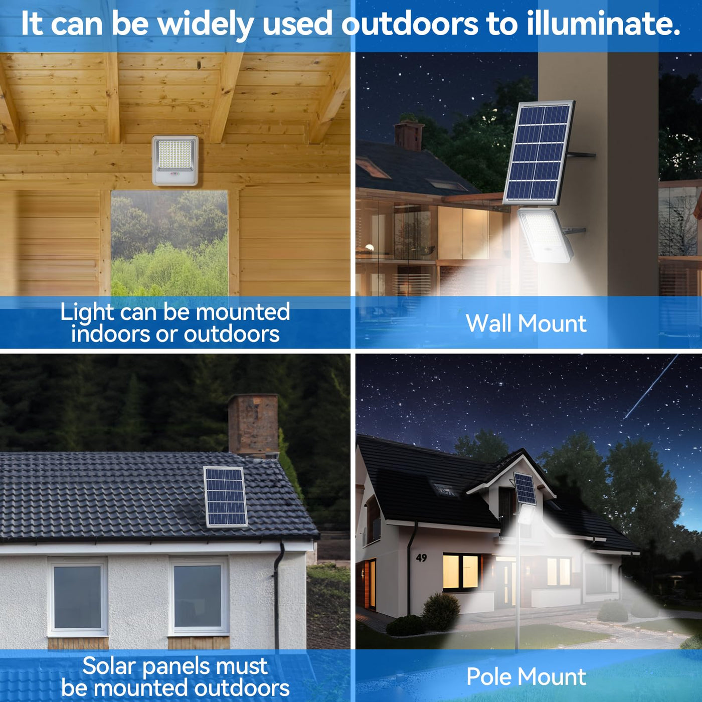 Q: What is the installation process for this solar flood light?A: Installation is simple and flexible; you can either hang the light or fix it with screws. All necessary screw accessories are included in the package, along with a 16.4ft extension cable to connect the solar panel to the flood light.
