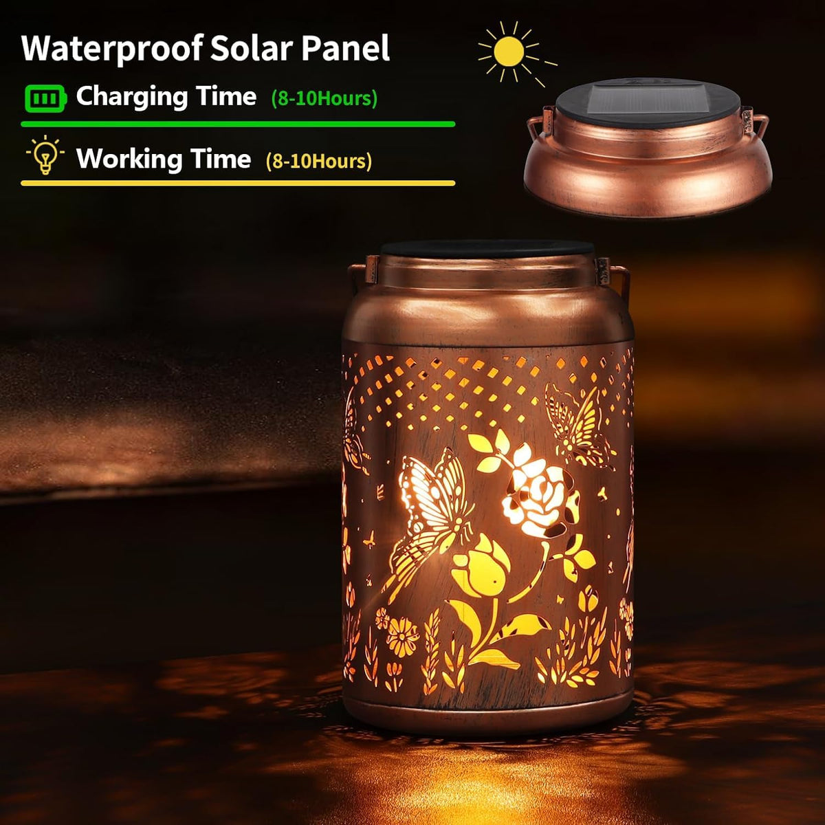 Tepaken 2 Pack Solar Lanterns Outdoor Waterproof, Butterfly Rose Garden Decor Birthday Gifts For Women Mom Grandma Hanging Solar Lights Metal Solar Decoration Outside For Yard, Patio, Lawn, Pathway