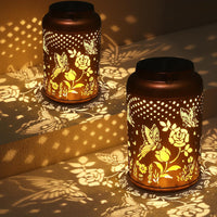 Q: What are the unique design features of the Tepaken Solar Lanterns?A: The Tepaken Solar Lanterns feature a graceful decorative design with a retro appearance in a gold copper color. The hollow metal veneer creates beautiful butterfly rose patterns that cast warm light, enhancing the ambiance of any outdoor space.
