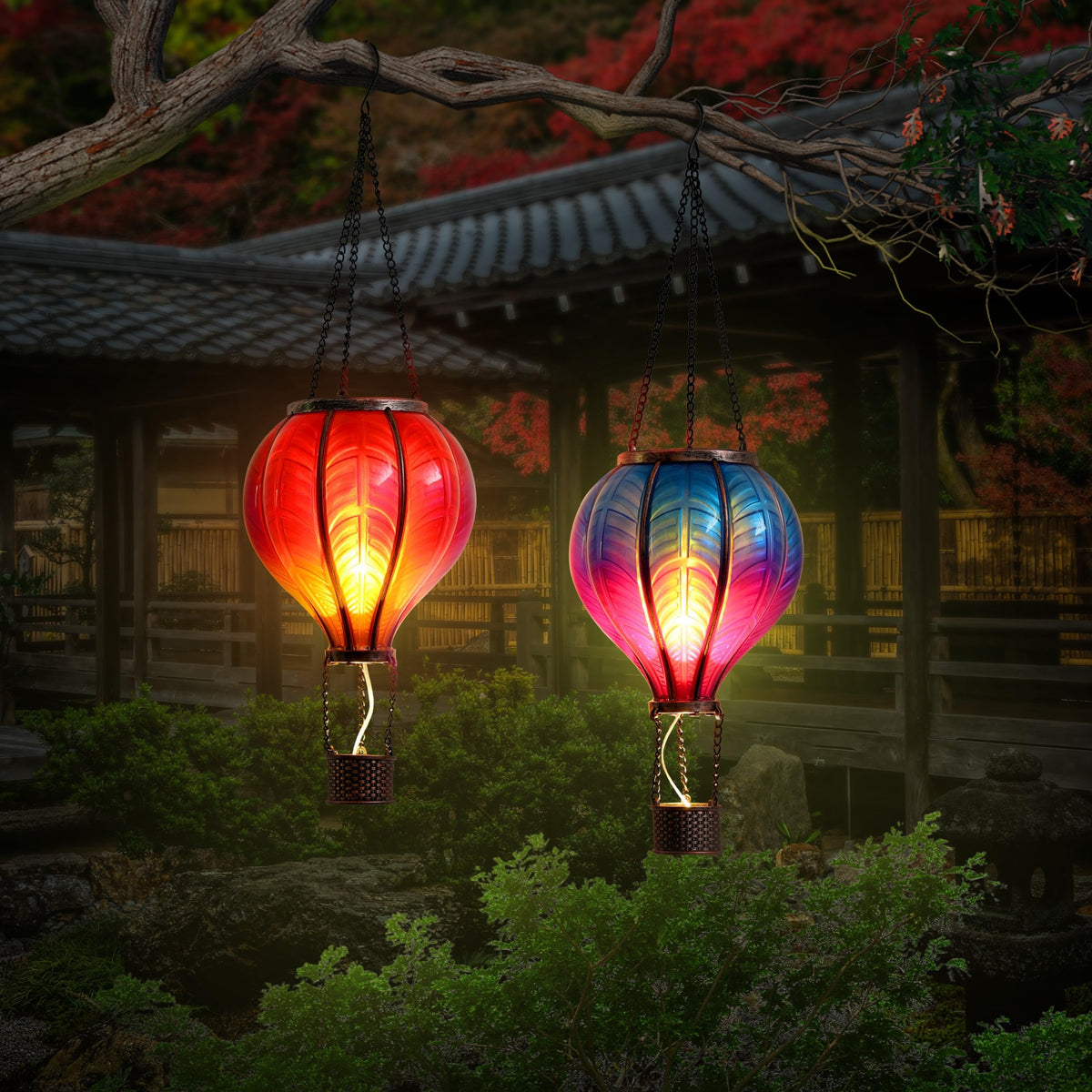 Teresa'S Collections 2 Pack Hanging Solar Lantern Outdoor Garden Decor ,Waterproof Plastic Hot Air Balloon Red Flickering Flame Effect Lantern For Yard Tree,Gift For Mom Lovers,18"