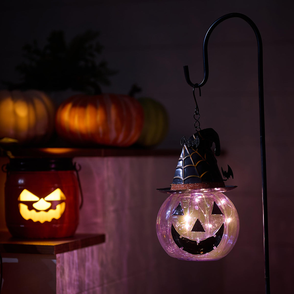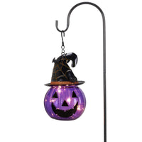 - **Original Halloween Design**: The lantern showcases a unique design with vibrant purple translucent glass, highlighted by classic pumpkin and bat motifs, creating an enchanting and eerie atmosphere for family and friends.