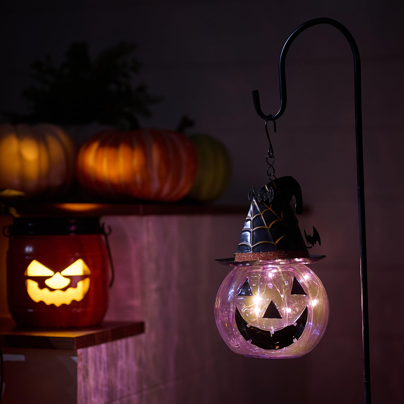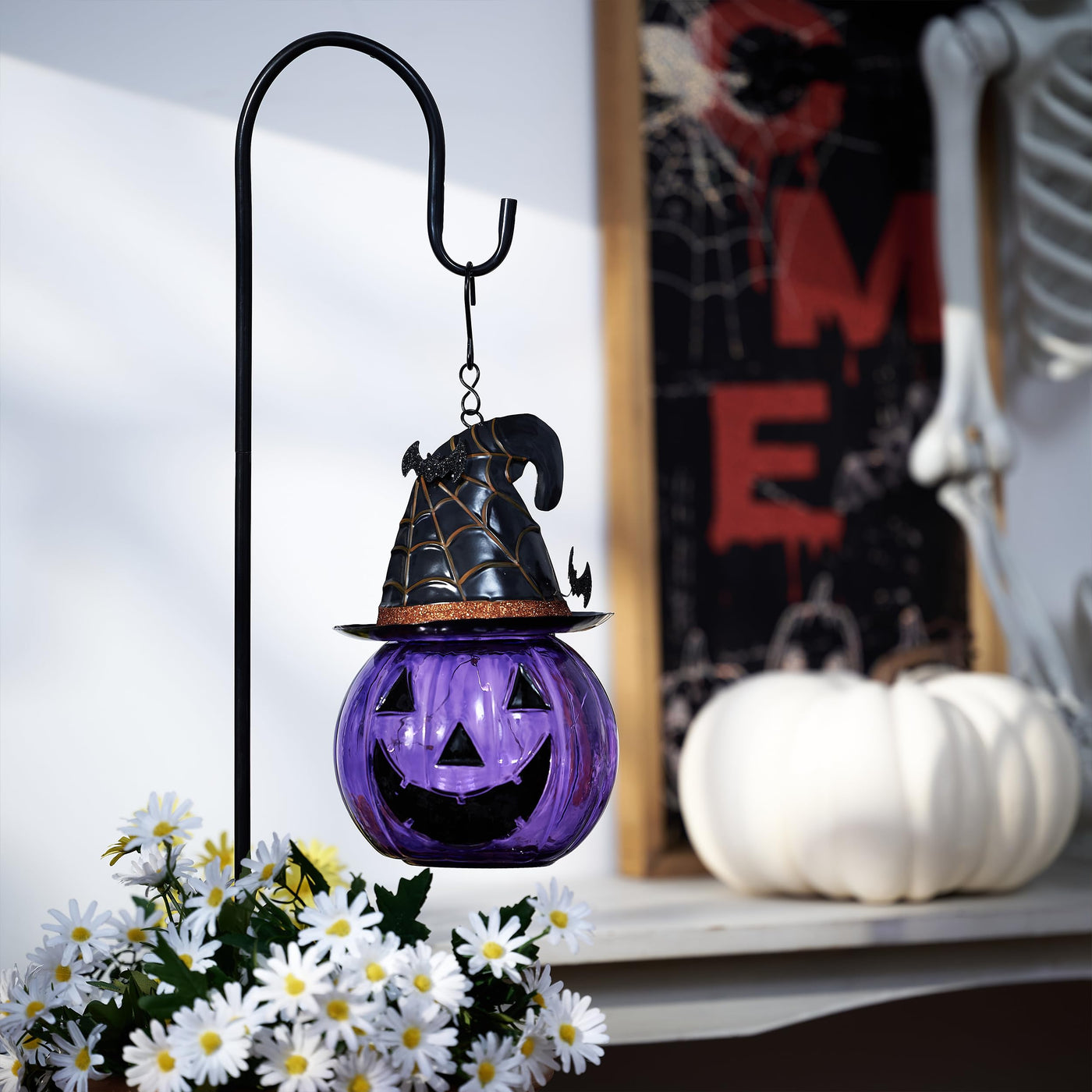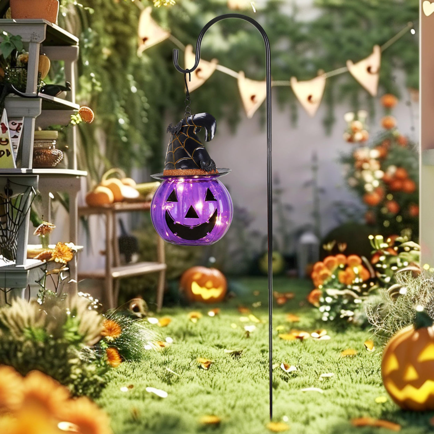 Bring a touch of spooky charm to your outdoor space with TERESA'S COLLECTIONS Halloween Decorations. This stunning 36-inch Glass Solar Lantern Stake, featuring whimsical purple pumpkins and playful bats, is the perfect addition to your Halloween decor, transforming your garden, lawn, or patio into a hauntingly beautiful setting for gatherings and celebrations.