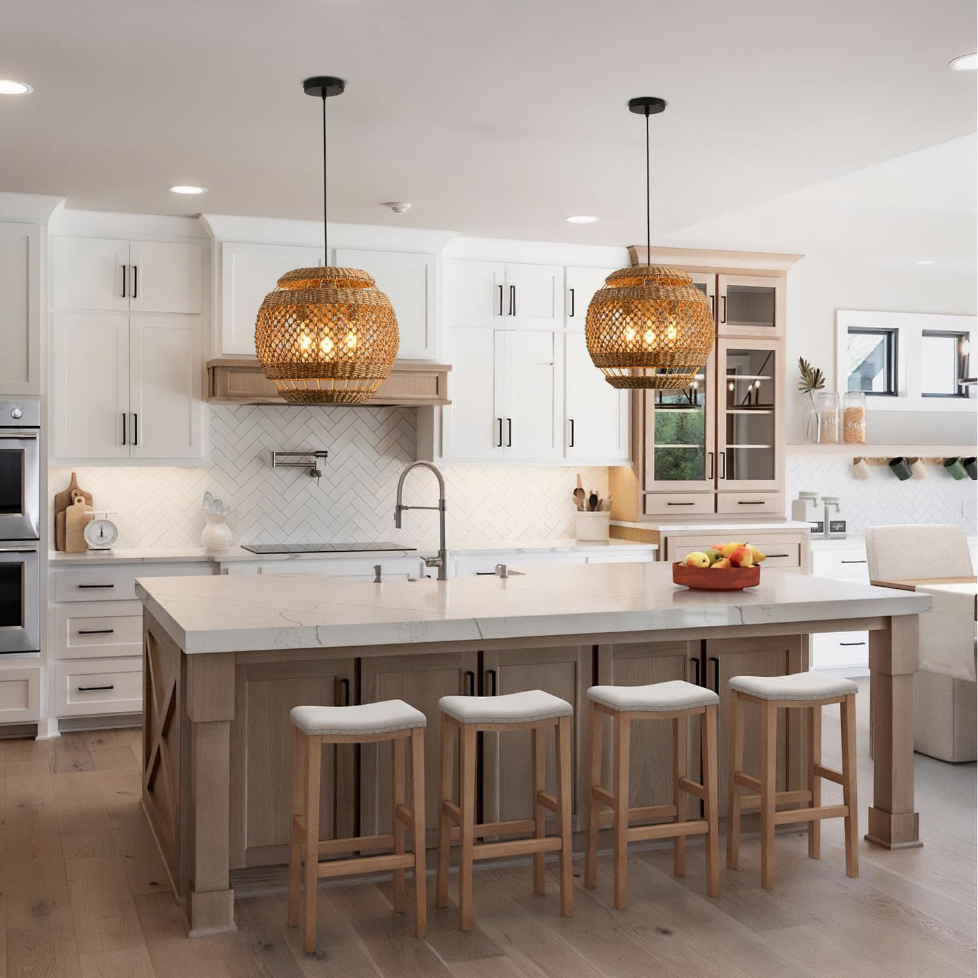 Teru Ji Kaikang Rattan Pendant Light Fixtures,15.75'' Boho Pendant Light,3-Light Hand Woven Water Plants Rattan Chandelier For Dining Living Bedroom Kitchen Farmhouse