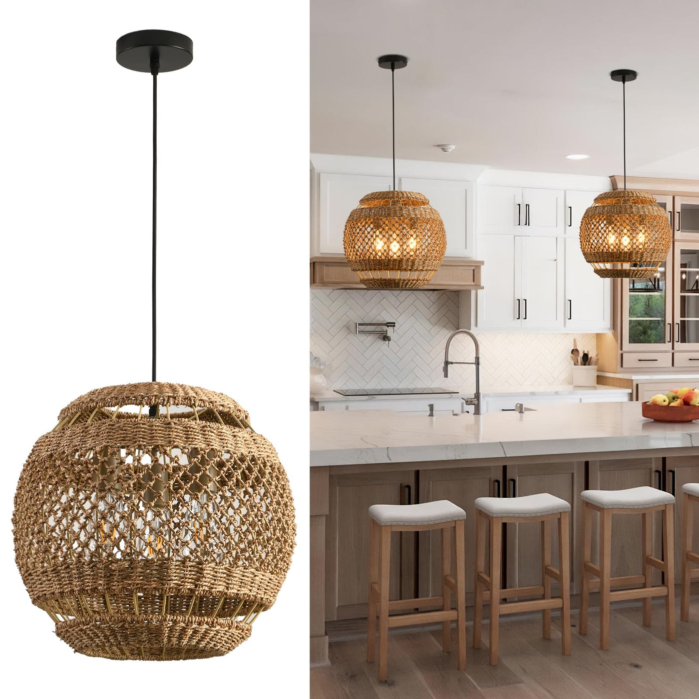 Teru Ji Kaikang 15.75'' Rattan Pendant Light 3-Light Boho Seagrass Hanging Light Hand Woven Water Plants Rattan Chandelier For D