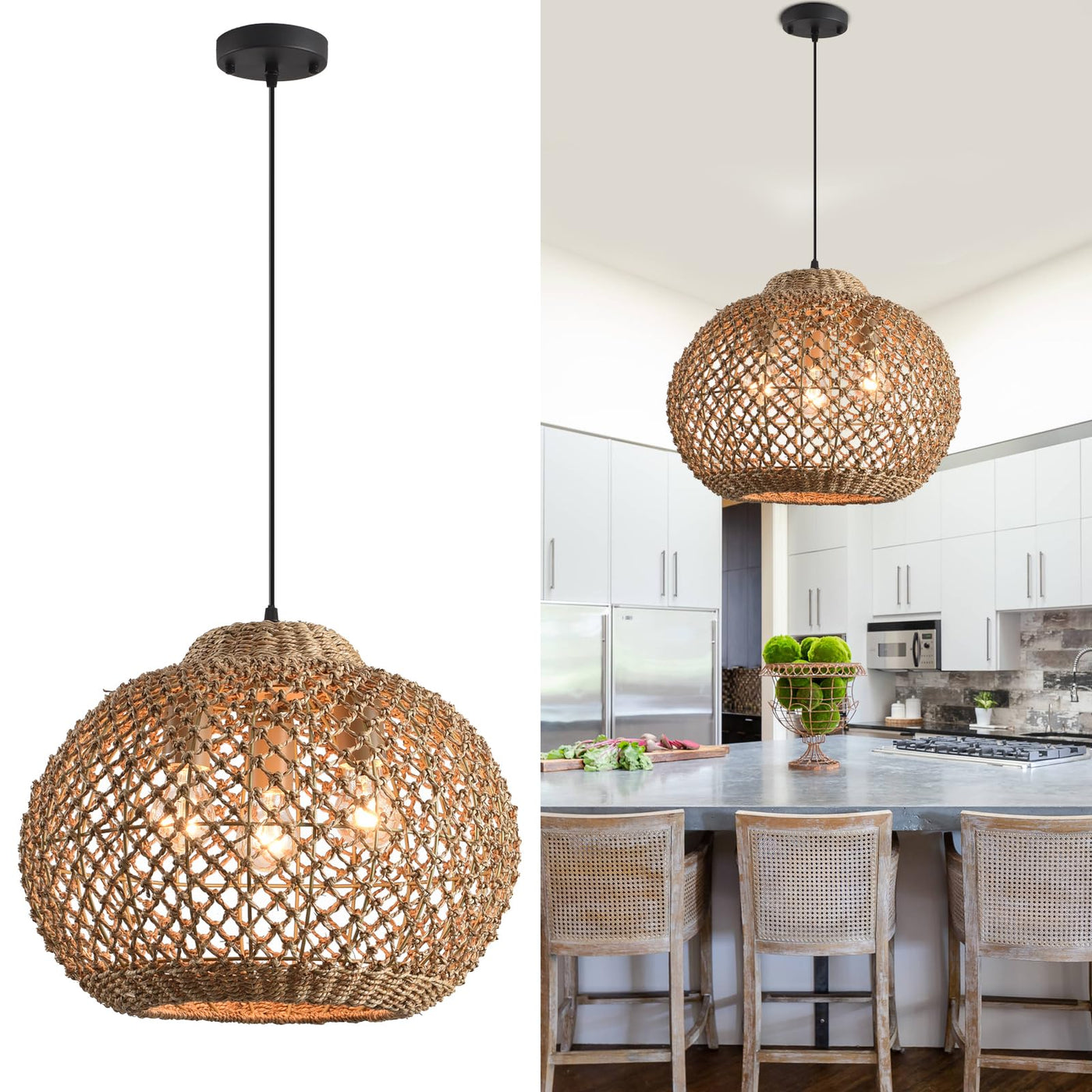 Teru Ji Kaikang 17'' Rattan Pendant Light,3-Light Boho Hand Woven Wicker Seagrass Hanging Light Water Plants Rattan Chandelier F
