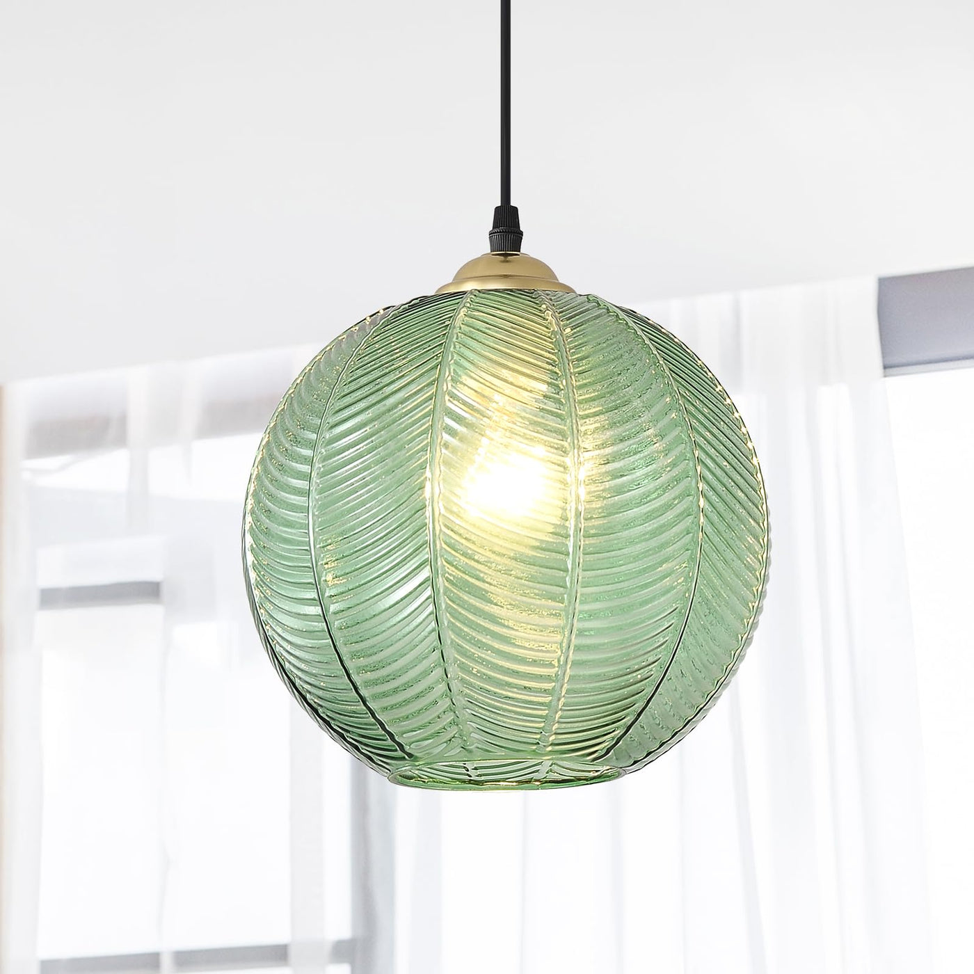 Testoys Green Glass Pendant Light, Single Large Globe Pendant Lighting 9.8-Inch Nordic Ribbed Ceiling Hanging Modern Ball Chande