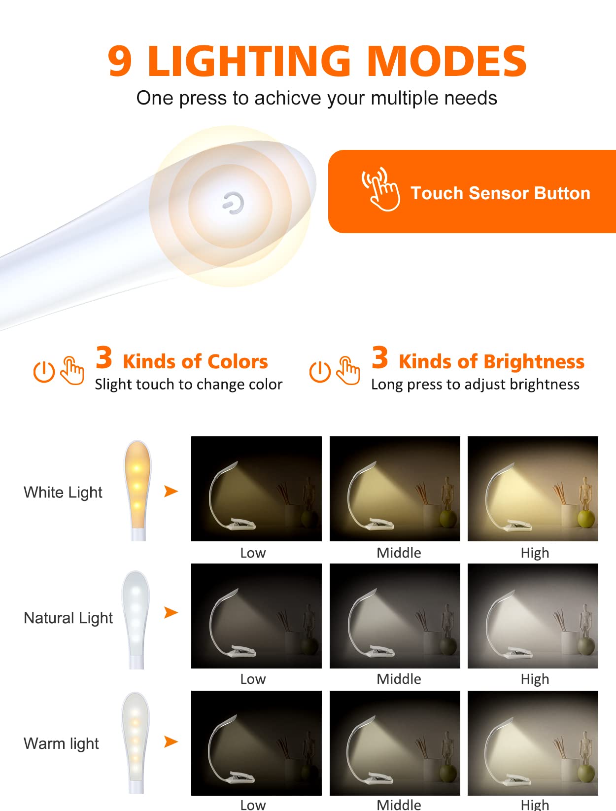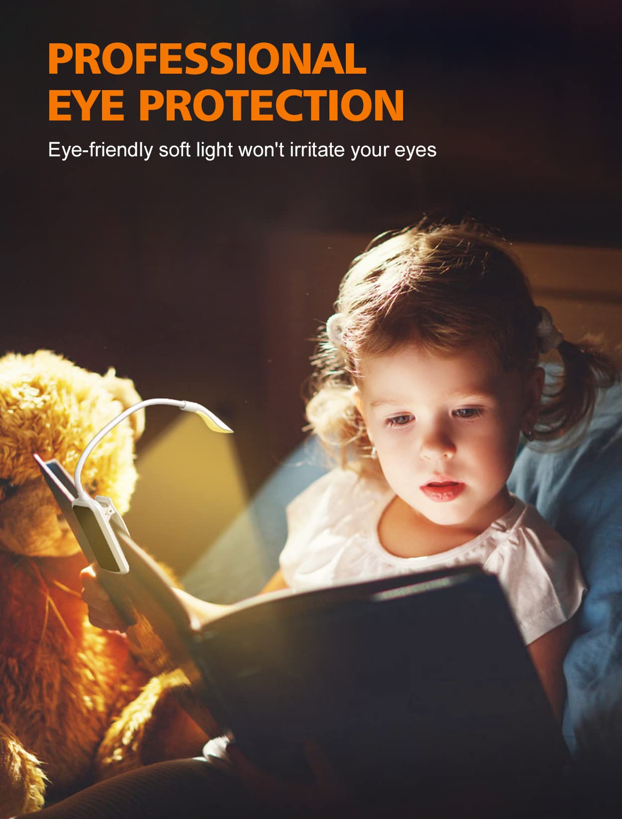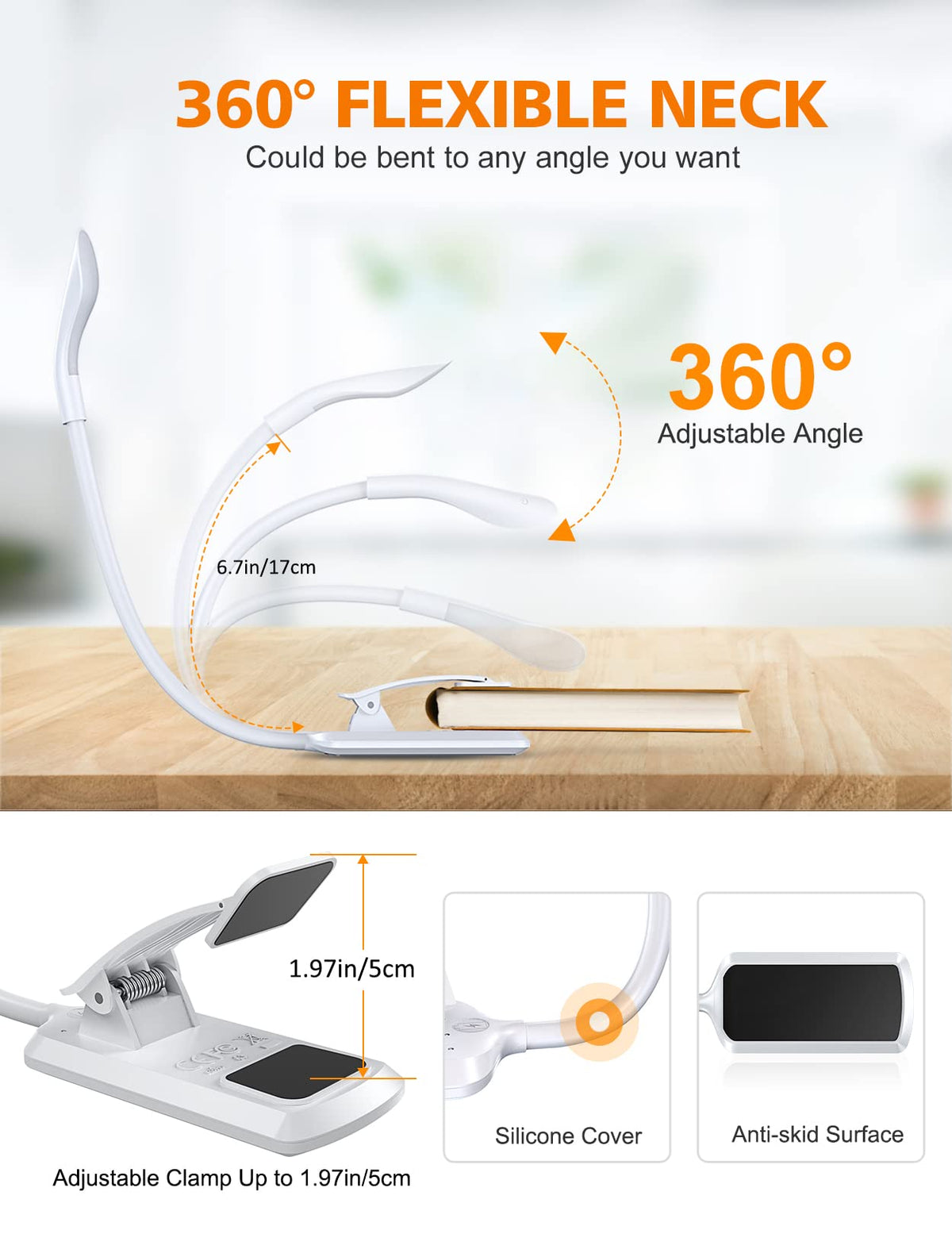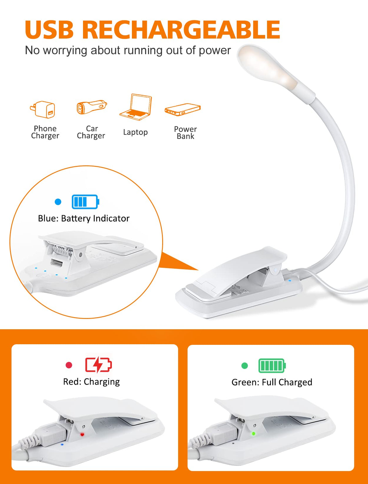 USB Port LED Book Lamp The bed reading light can be operated with any USB charger, e.g. B. laptop, PC, power bank, mobile phone power adapter and car charger.Practical Status Display The battery indicator informs you about the remaining power and charge status at any time. Don t worry about the lamp going out without warning.As a Book Lamp 3000K warm light. The most suitable color temperature for reading between parents and children.As a Night Light It creates a private reading area just for you to use when your partner sleeps next to you.As a Desk Lamp The LED clamp light with a height of 17cm provides brightness when you work at night. Lightweight & Portable - Weighing in at 63 g, light enough to read or carry around in bed at night. - Packed very small, fits in a handbag or suitcase. - Take it with you wherever you go, e.g. B. at home, in the hotel, when traveling, in the car, on the plane, etc.Package Included:: 1 x Book Lamp 1 x USB Charging Cable 1 x User Manual