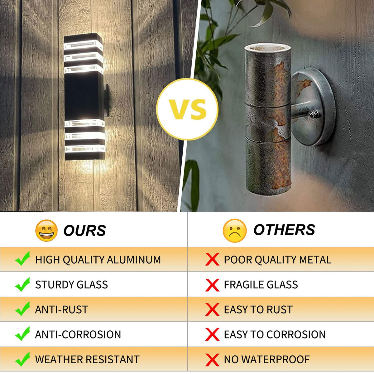 Q: What are the benefits of using the Tewei 6 Pack Up and Down Outdoor Wall Lights?A: The Tewei outdoor wall lights offer stylish illumination with their modern design, are made from durable die-casting aluminum to resist rust, and feature IP65 waterproofing for reliable performance in harsh weather conditions. They provide efficient lighting with included GU10 7W 3000K LED bulbs, making them energy-saving and ideal for various outdoor settings.