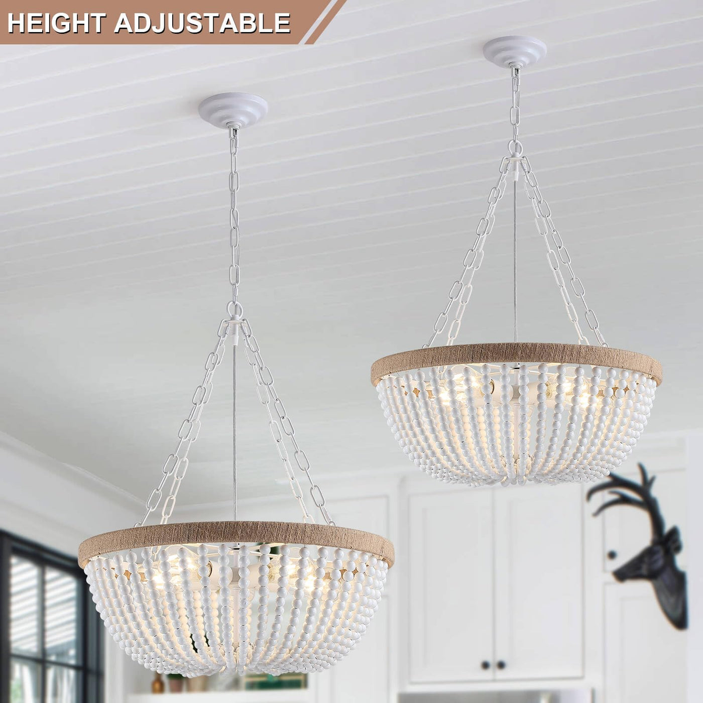 Q: What is the height adjustment range for the Tewei 5 Lights White Bohemia Wood Beaded Chandelier?A: The Tewei chandelier features an adjustable chain that allows for a height range from 1 inch to 47 inches, with a maximum overall height of 55 inches, making it versatile for various ceiling heights.