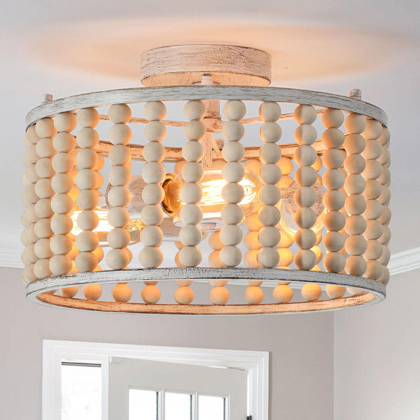 Tewei Wood Beaded Boho Chandelier Light Fixture - Rustic Semi Flush Mount Ceiling Light, E26 Base