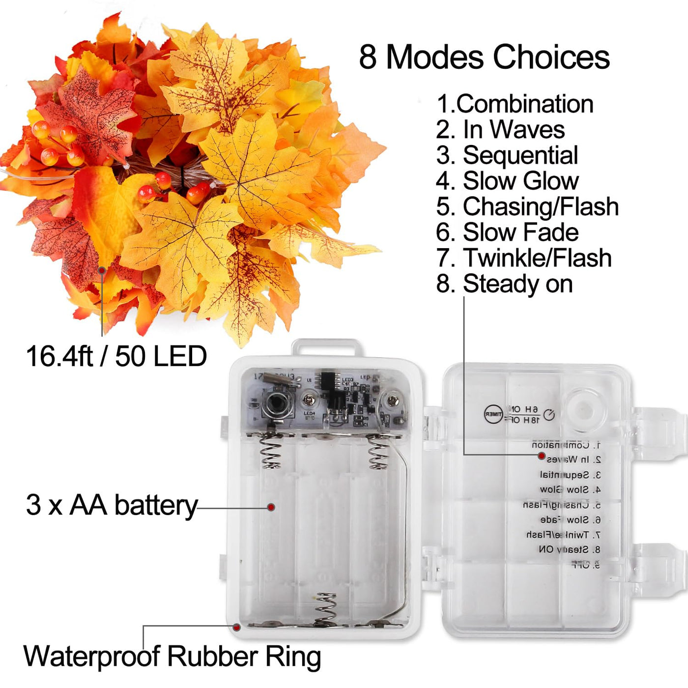 The autumn fall garland lights with timer, no wiring required, and not a battery eater, press the remote and set timer function to save your time.