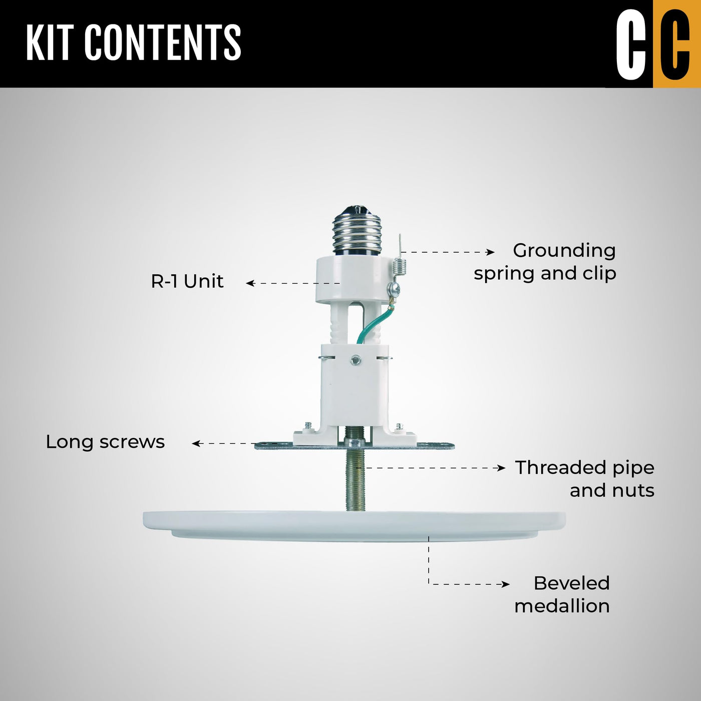 HASSLE-FREE CONVERSION: Effortlessly transform your existing 4", 5", and 6" recessed can lights into elegant pendant or hanging fixtures with The Can Converter - R1. This easy-to-use kit simplifies the process, allowing you to enhance your home’s lighting without the need for professional assistance. Perfect for any room, this kit offers a quick and cost-effective way to upgrade your lighting decor. | ELEGANT DESIGN: Featuring a beautifully crafted beveled ceiling medallion, this R1 kit adds a touch of sophistication to any room. This medallion not only covers the recessed can opening but also enhances the visual appeal of your new lighting fixture. Ideal for modern and classic interiors alike, it provides a stylish finishing touch that complements any decor. | DURABLE CONSTRUCTION: Made from premium-grade steel ensuring exceptional durability and long-lasting performance. Engineered to support fixtures up to 5lbs, this conversion kit is reliable and safe. Whether you're installing a delicate pendant light or a heavier hanging fixture, you can trust in the strength and stability of our high-quality materials. | SIMPLE INSTALLATION: Our conversion kit comes with all the necessary hardware, including an 8¼ beveled ceiling medallion and medium base light socket adapter, making installation straightforward and hassle-free. The design eliminates the need for patchwork, saving you time and effort. Additionally, detailed step-by-step instructions and access to online instructional videos provide extra guidance, ensuring a smooth and professional installation process. | CERTIFIED QUALITY: This kit is made with premium-grade steel materials with UL Certified design, signifying its adherence to the highest standards of safety and quality. This certification guarantees that our product has been rigorously tested for strength, durability, and reliability. You can install your new lighting fixtures with confidence, knowing that they meet strict safety guidelines and will perform exceptionally over time. | FLEXIBLE SOLUTION: Perfect for kitchens, living rooms, bedrooms, and more, The Can Converter - R1 is a versatile solution that caters to various lighting needs. Its user-friendly design makes it suitable for both beginners and seasoned DIY enthusiasts. Whether you’re looking to update a single fixture or undertake a comprehensive home lighting renovation, this kit offers the flexibility and functionality to achieve your desired results.