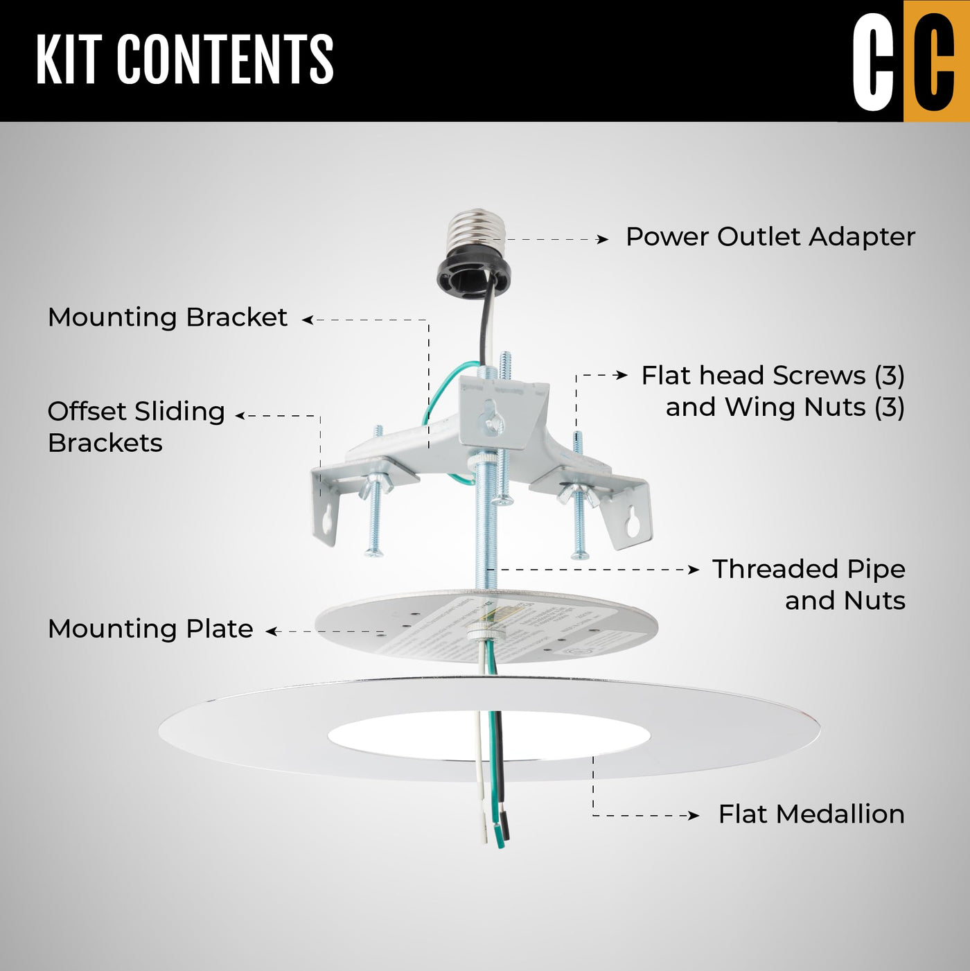 Q: Is The Can Converter - R56 durable and safe for heavy fixtures?A: Yes, The Can Converter - R56 is made from premium-grade steel, ensuring exceptional durability. It can support hanging light fixtures up to 50lbs and ceiling fans up to 35lbs, providing a reliable and safe solution for various lighting needs.