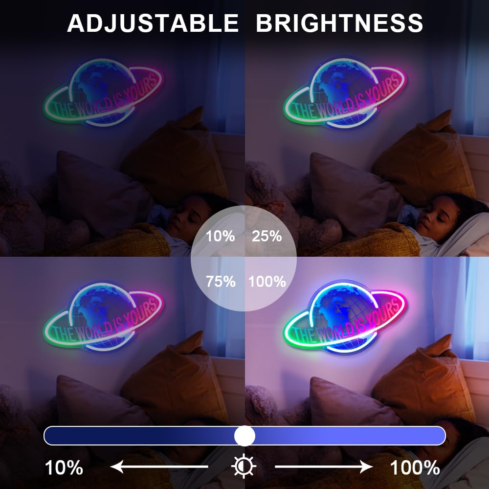 ?CONVENIENT REMOTE & APP CONTROL? Take complete control of your lighting with the included remote control and APP operation. Schedule on/off times, adjust brightness from 10% to 100%, and customize colors with ease. ?SLEEK & STYLISH DECOR? Elevate your decor with the modern and stylish world is yours LED sign. Measuring 15.7 x9.8, its powered by a 5V USB interface for easy installation using the hanging chain or screws. ?CREATIVE DESIGN, VIBRANT COLORS? The world is yours neon sign features a stunning UV earth design that brings life to any space. With 210 color options and dynamic modes, you can easily set the mood for any occasion. ?PERSONALIZE YOUR SPACE? Transform your bedroom, gaming room, or office with customizable colors and dynamic modes. Express your unique style and preferences with the world is yours light up sign. ?INSPIRE CREATIVITY & POSITIVITY? Seamlessly blend the world is yours sign into your interior design. Let this sign spark creativity, positivity, and a sense of adventure in your environment, making everyday moments extraordinary.
