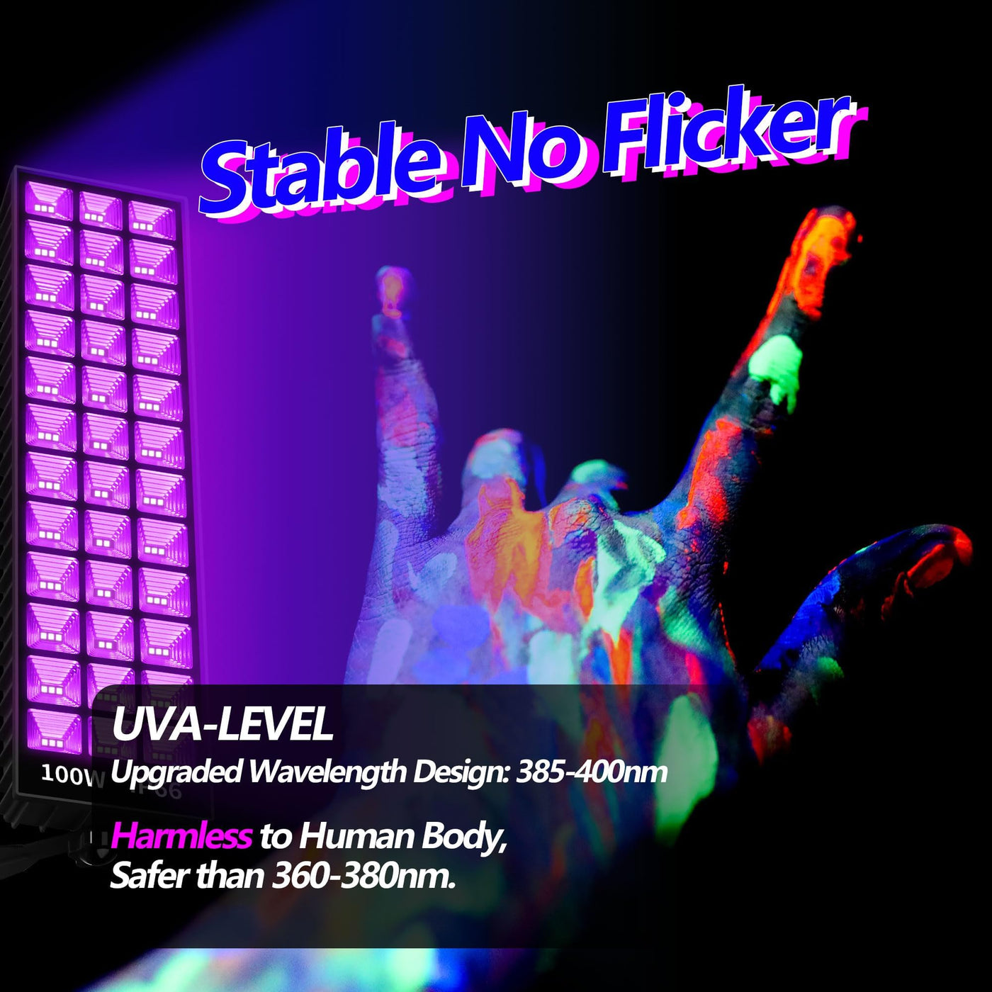 Q: What is the wavelength of the THECHAM 100W Black Light Bar and why is it important?A: The THECHAM 100W Black Light Bar operates at a wavelength of 385-400nm. This range is safer for the human body and eyes compared to 365nm black lights, making it an excellent choice for various events and applications, including glow parties and art displays.