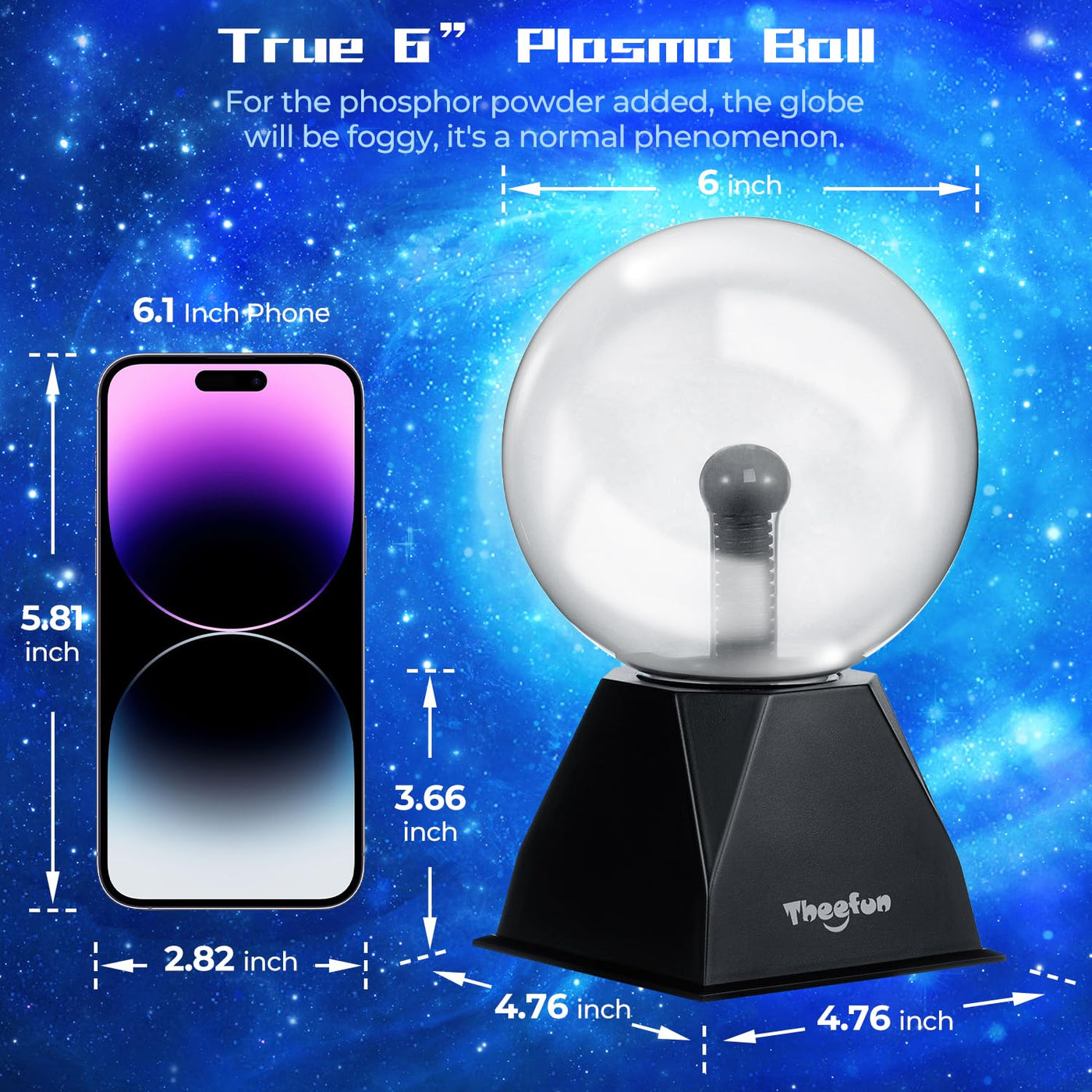 Q: What are the dimensions and weight of the plasma ball?A: The Theefun Blue Plasma Ball has a size of 6 inches in diameter and weighs approximately 1.76 pounds, making it a manageable size for various decorative and functional uses.
