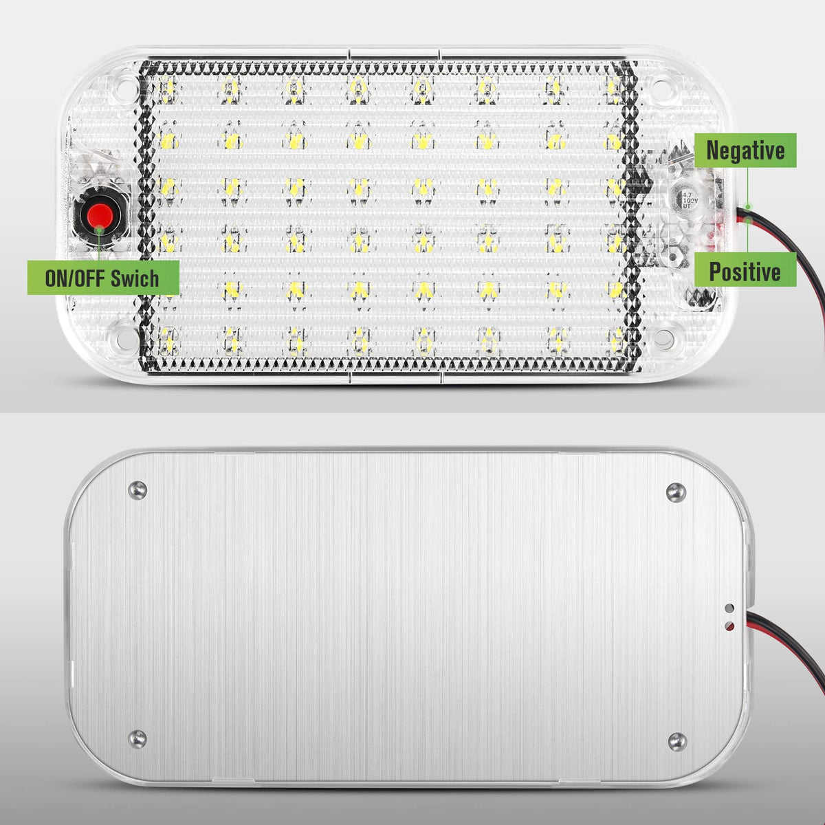 Product Specifications: - Type: RV ceiling dome light - Material: pc + aluminum alloy - Light color: white - Voltage: 12-85V DC - Wattage: 10W - LED number: 48 LED - Switch control: ON/OFF - Dimensions: 5.9 X 2.95 X 0.35in (15 x 7.5 x 0.9cm)