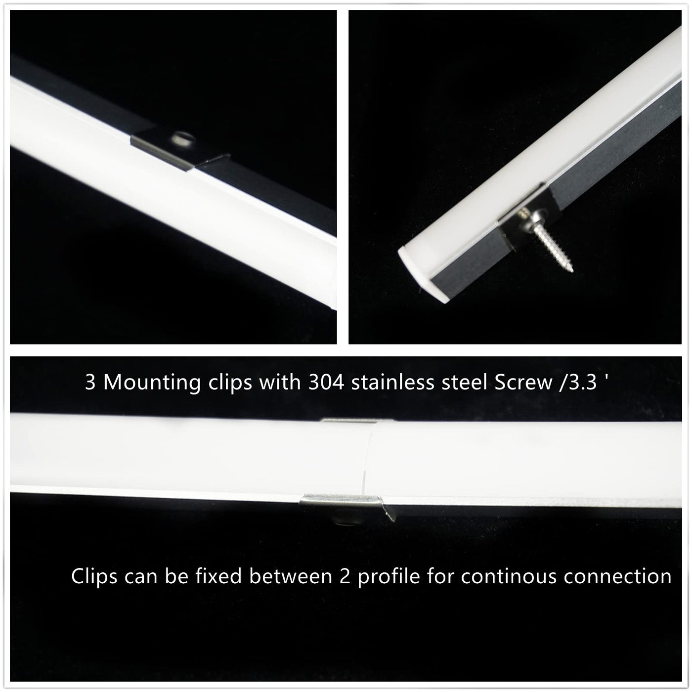 Q: What comes included in the complete kit?A: The complete kit includes 10 pieces of 3.28FT V shape aluminum channel, 10 milky covers, 30 stainless steel countersunk screws, 10 end caps with holes, 10 end caps without holes, 30 stainless steel mounting clips, and 2 corner connectors, providing everything you need for installation.