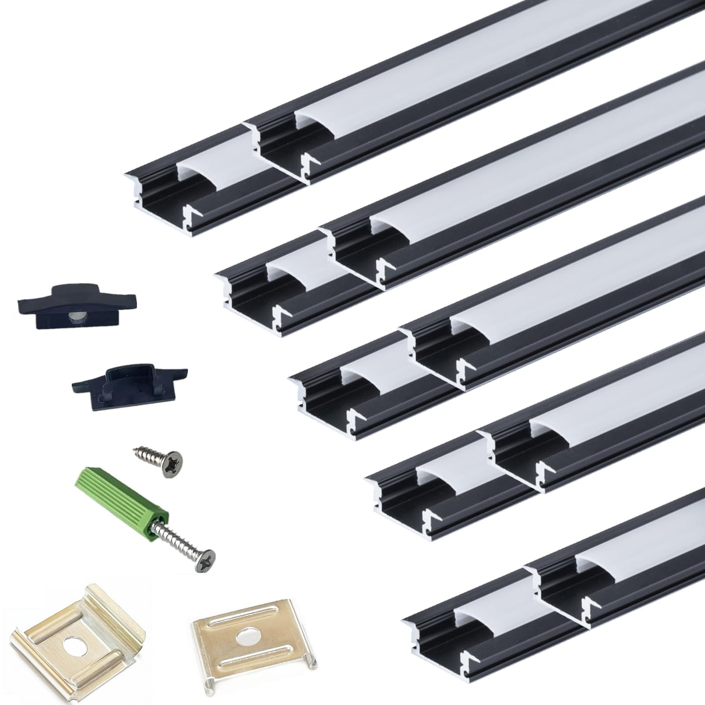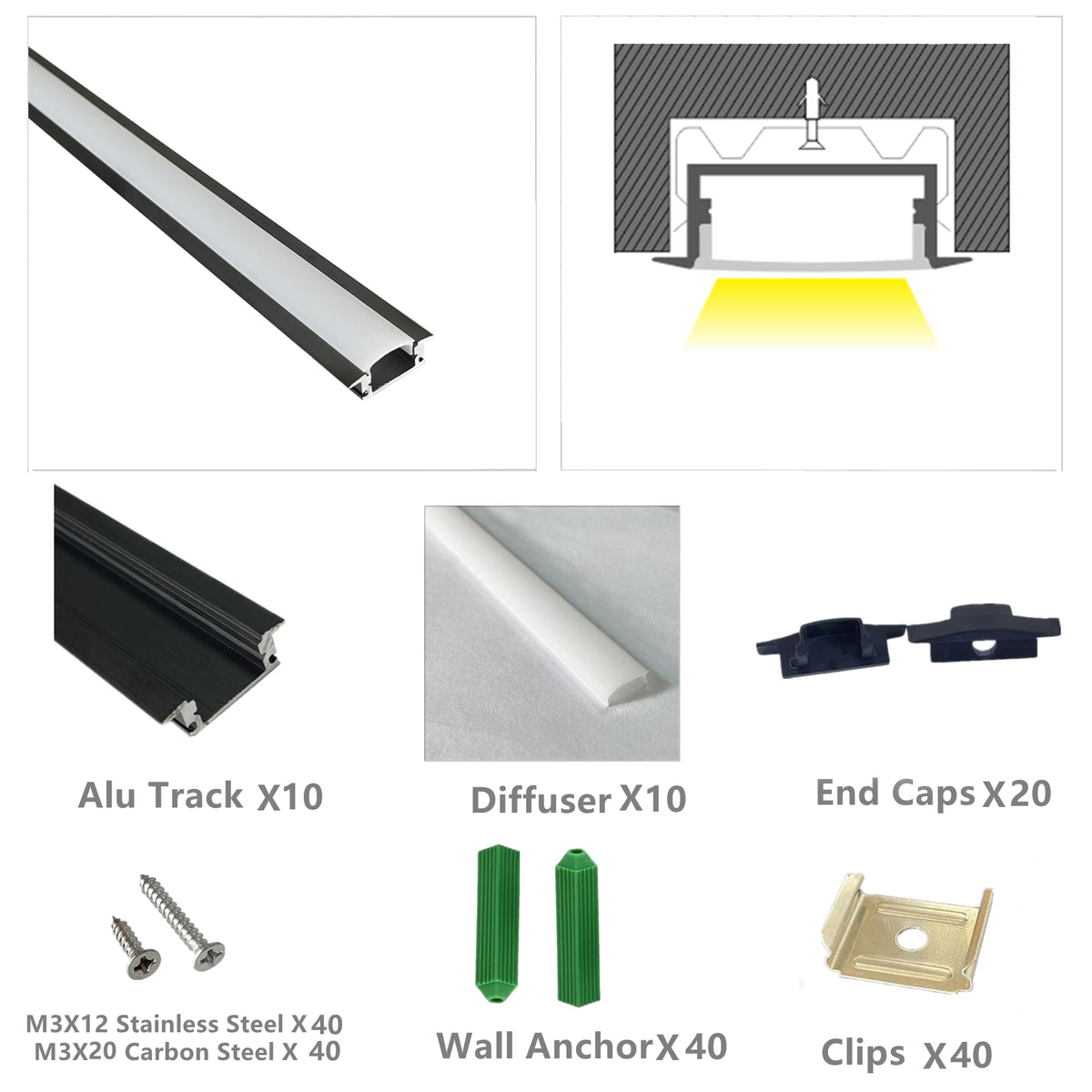Q: What is included in the THMOOTHER LED channel package?A: The package includes 10 pieces of 6.56FT aluminum channels, 10 pieces of 6.56FT plastic milky covers, 40 stainless steel countersunk screws, 40 stainless steel mounting clips, 20 end caps with holes, and 20 end caps without holes.