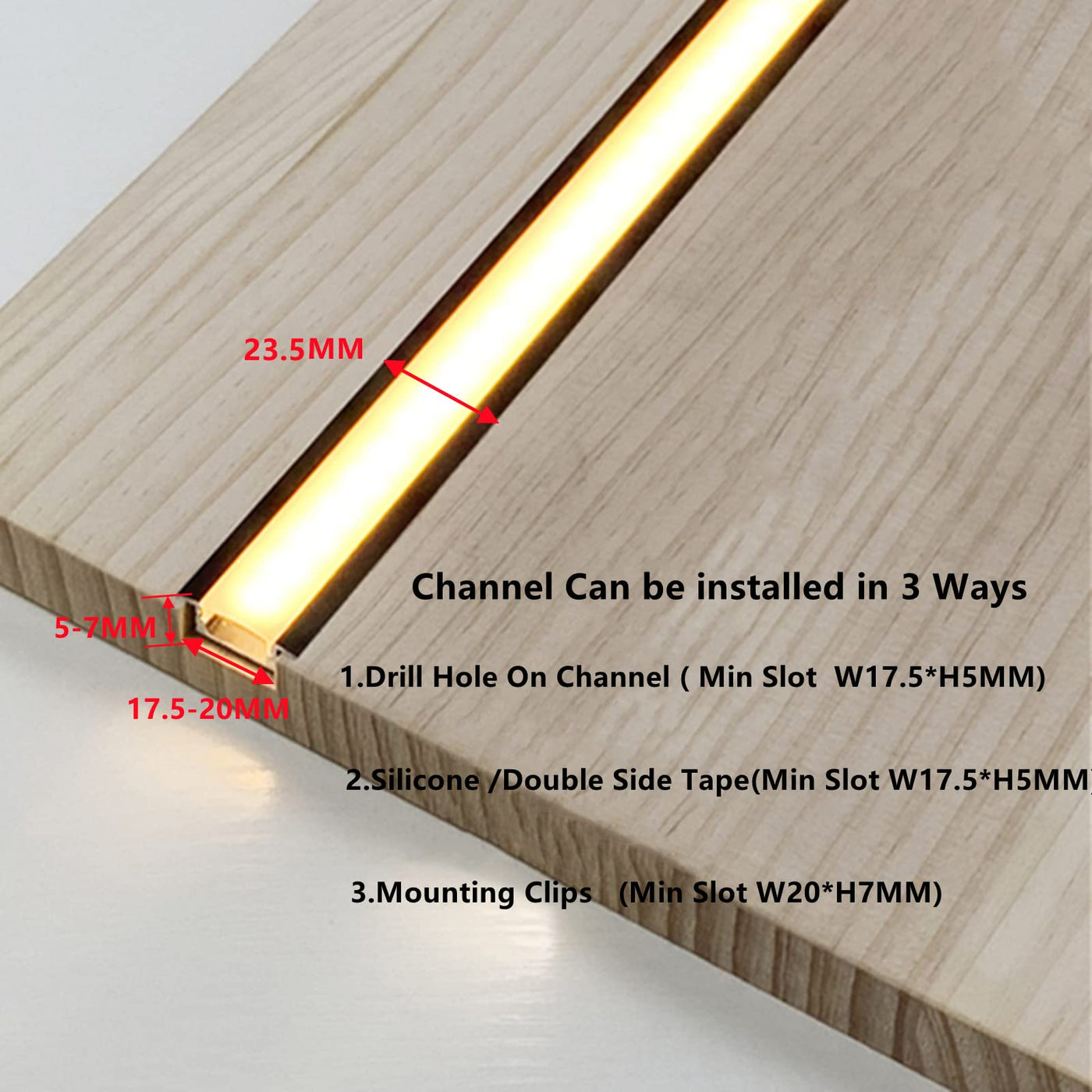 1.Protect the exposed strip from Dust,Moisture and inadvertent touch,extend the lifespan of the strip 2. Provide a New Professional Clean finish to the exposed fixtures,Take your LED strips to the next level 3. breake up the harshness dots from the led strip without making light too dim, evening out the lights to a fairly smooth glow. Steps for a DIY Lighting Project 1.Measure the width of the strip ( make sure it is not oversized in the channel ) and test it 2.Trim the channel and cover to a required length by hacksaw or other devices if needed . 3.Open a Slot (For recessed mounted,open the slot before installation ), flush channel end to end for extension 4.Peel off the sticky at the back of the strip ,lay the strip in the channel 5.Slide the cover into the slot (If not work snap the cover from end to end ) ,fix the end caps if needed 6.Wiring Packing details 1.6.56FT/200CM Aluminum Channel -10 pieces 2.6.56FT/200CM Plastic Milky Cover -10 Pieces 3.Stainless Steel Countersunk Screw -40 Pieces 4.Stainless Steel Mounting Clips -40 Pieces 5.End Cap With Hole -20 Pieces 6.End Cap Without Hole-20 Pieces