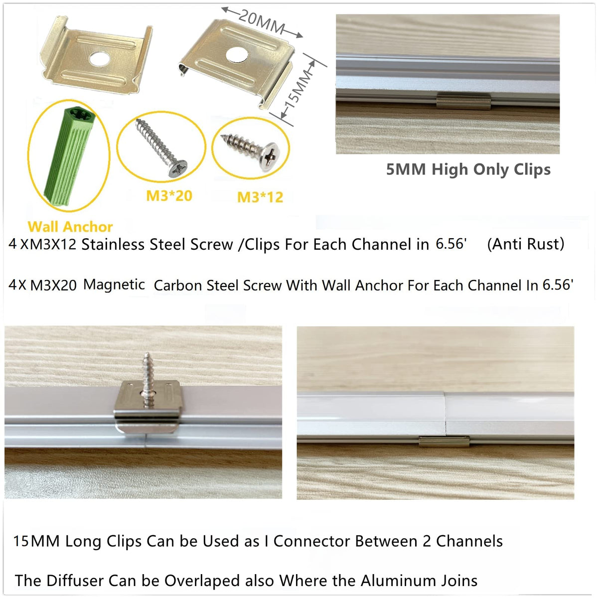 1.Protect the exposed strip from Dust,Moisture and inadvertent touch,extend the lifespan of the strip 2. Provide a New Professional Clean finish to the exposed fixtures,Take your LED strips to the next level 3. breake up the harshness dots from the led strip without making light too dim, evening out the lights to a fairly smooth glow. Steps for a DIY Lighting Project 1.Measure the width of the strip ( make sure it is not oversized in the channel ) and test it 2.Trim the channel and cover to a required length by hacksaw or other devices if needed . 3.Open a Slot (For recessed mounted,open the slot before installation ), flush channel end to end for extension 4.Peel off the sticky at the back of the strip ,lay the strip in the channel 5.Slide the cover into the slot (If not work snap the cover from end to end ) ,fix the end caps if needed 6.Wiring Packing details 1.6.56FT/200CM Aluminum Channel -10 pieces 2.6.56FT/200CM Plastic Milky Cover -10 Pieces 3.Stainless Steel Countersunk Screw -40 Pieces 4.Stainless Steel Mounting Clips -40 Pieces 5.End Cap With Hole -20 Pieces 6.End Cap Without Hole-20 Pieces