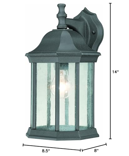 Q: What is the size of the Thomas Lighting SL94527 Hawthorne Outdoor Wall Lantern?A: The Thomas Lighting SL94527 Hawthorne Outdoor Wall Lantern measures 8.5 inches in length, 8 inches in width, and 14 inches in height, making it a compact and versatile lighting option for outdoor spaces.