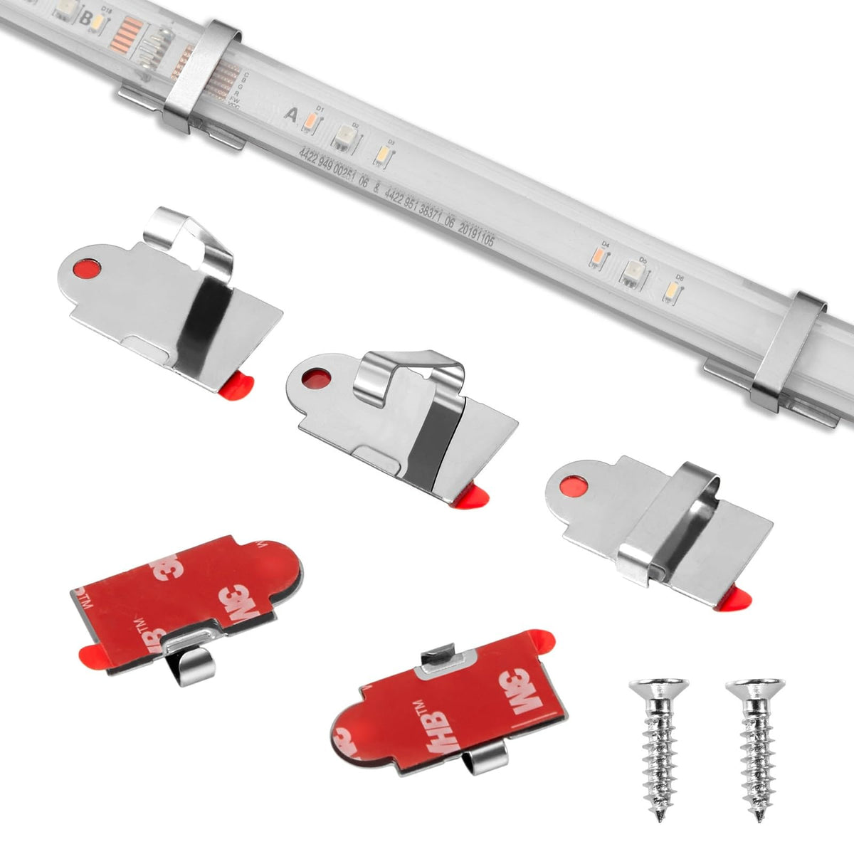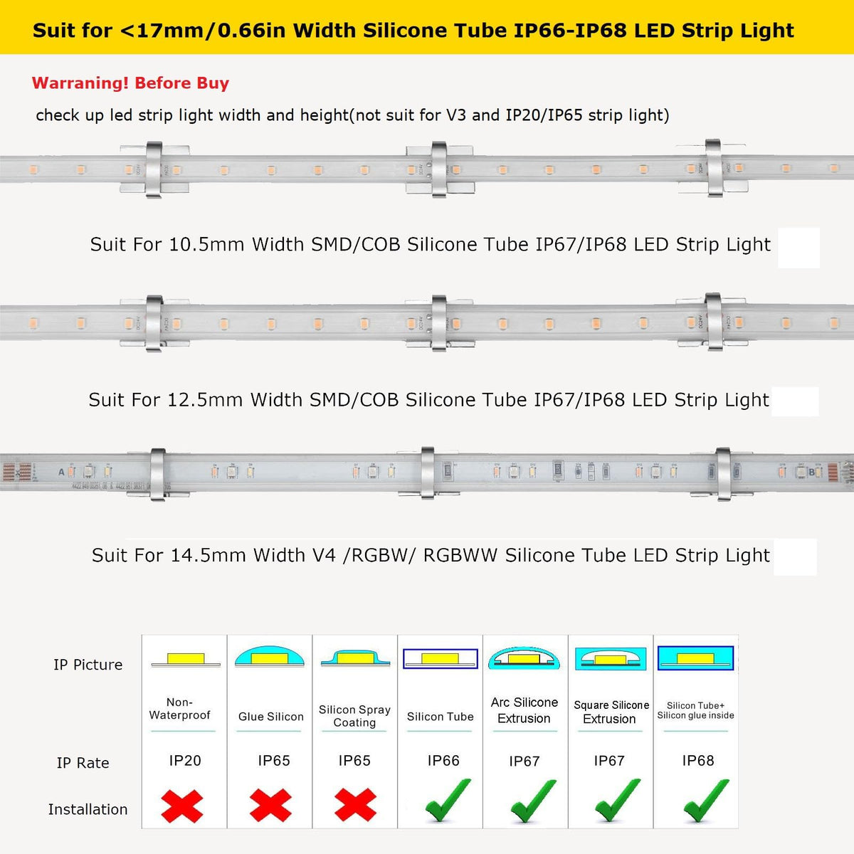 Warning :Check Up Your Led Strip Light Width And Height Before Buy This Led Tape Light Hookthis Led Tape Light Clip Have Two Fixing Methods:Adhesive And Screw Suitable For Different Scenepainted Walls, Painted/Varnished Wood, Paint Cinder Block Concrete, Metal,Glass,Gceramic Tile,House Eaves, Corridor,Indoor And Outdoor Wall.Led Strip Light Hook Ideal Work With Dc12V/24V Led Strip Light Type: Ip67/Ip68 Smd2835 60/90/120/144 Leds/Meterip67/Ip68 Smd5050 30/60/90 Leds/Meterip67/Ip68 Smd5630 30/48/60/120/144 Leds/Meter Ip67/Ip68 Smd3014 30/48/60/90/120/144 Leds/Meter Ip67/Ip68 Cob 360/480/512/528 Leds/Meter5V Usb Led Back Lightip67/Ip68 10-14Mm Wide Rgb/Rgbw/Rgbww/Rgbcct/Cct/V4 Led Strip Light