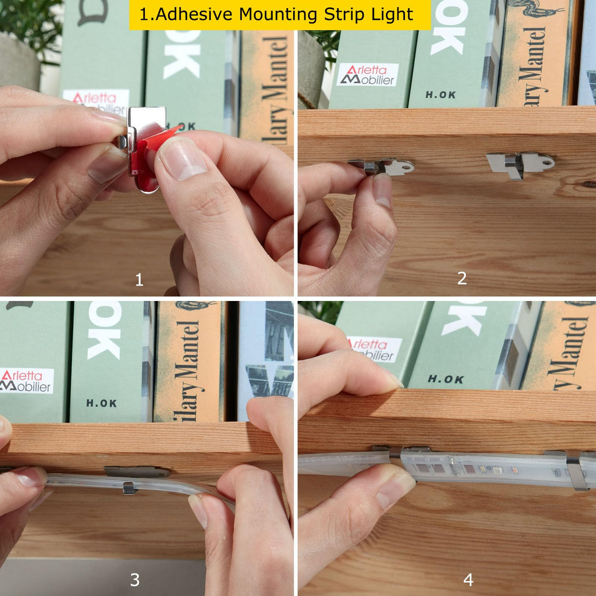 Q: How do I install the LED tape light clips using adhesive?A: To install the LED tape light clips with adhesive, first clean the surface where you will attach the clips. Then, remove the tape film and firmly press the clips against the surface for at least 7-10 seconds. For best results, wait 12 hours after installation before attaching the LED strip light.