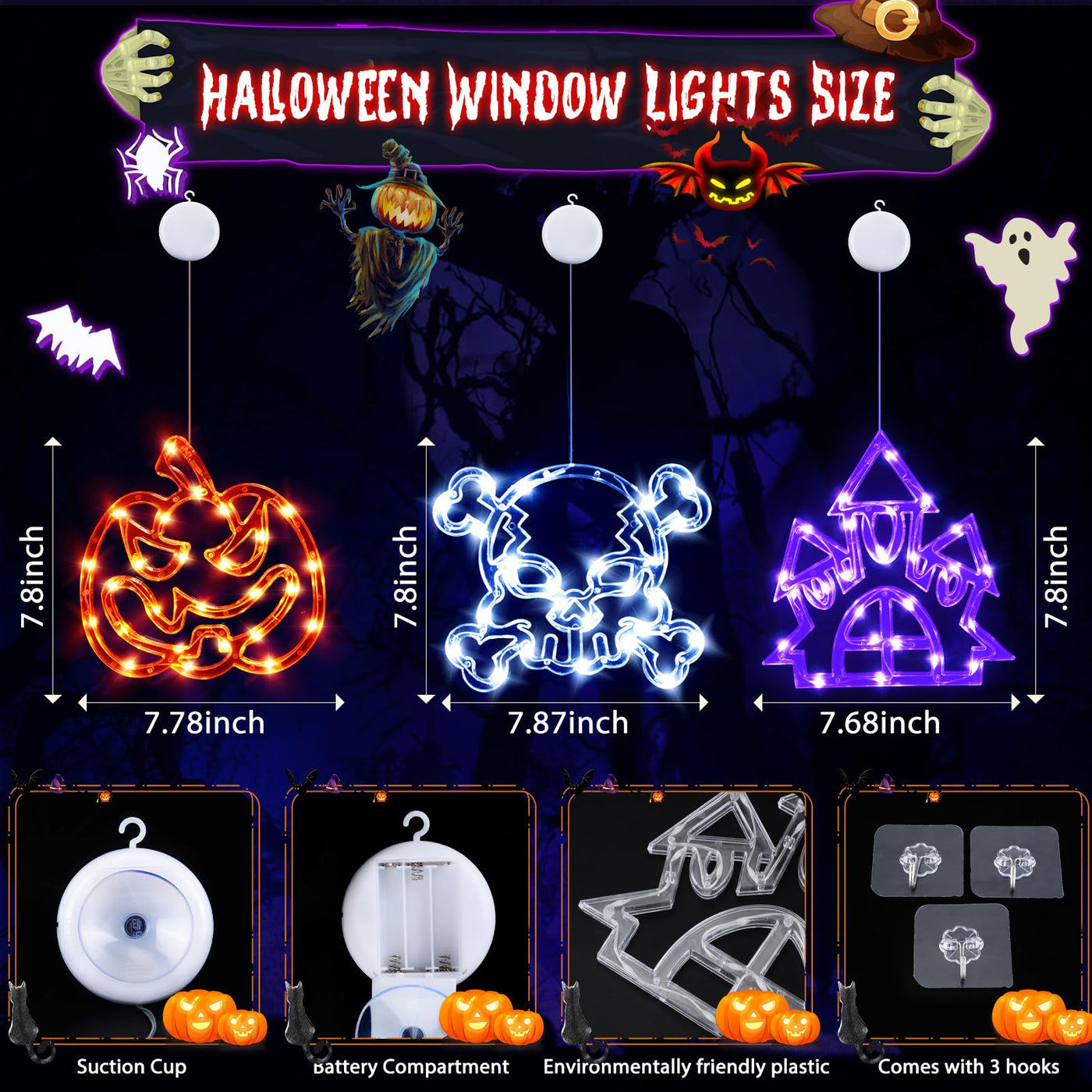Tiaxidex Halloween Window Lights, Halloween Decorations 3Pcs Skull Pumpkin Castle With Modes Of Flashing And Steady Light With Suction Cup, Upgrade Timer, Battery Operated Halloween Window Decoration