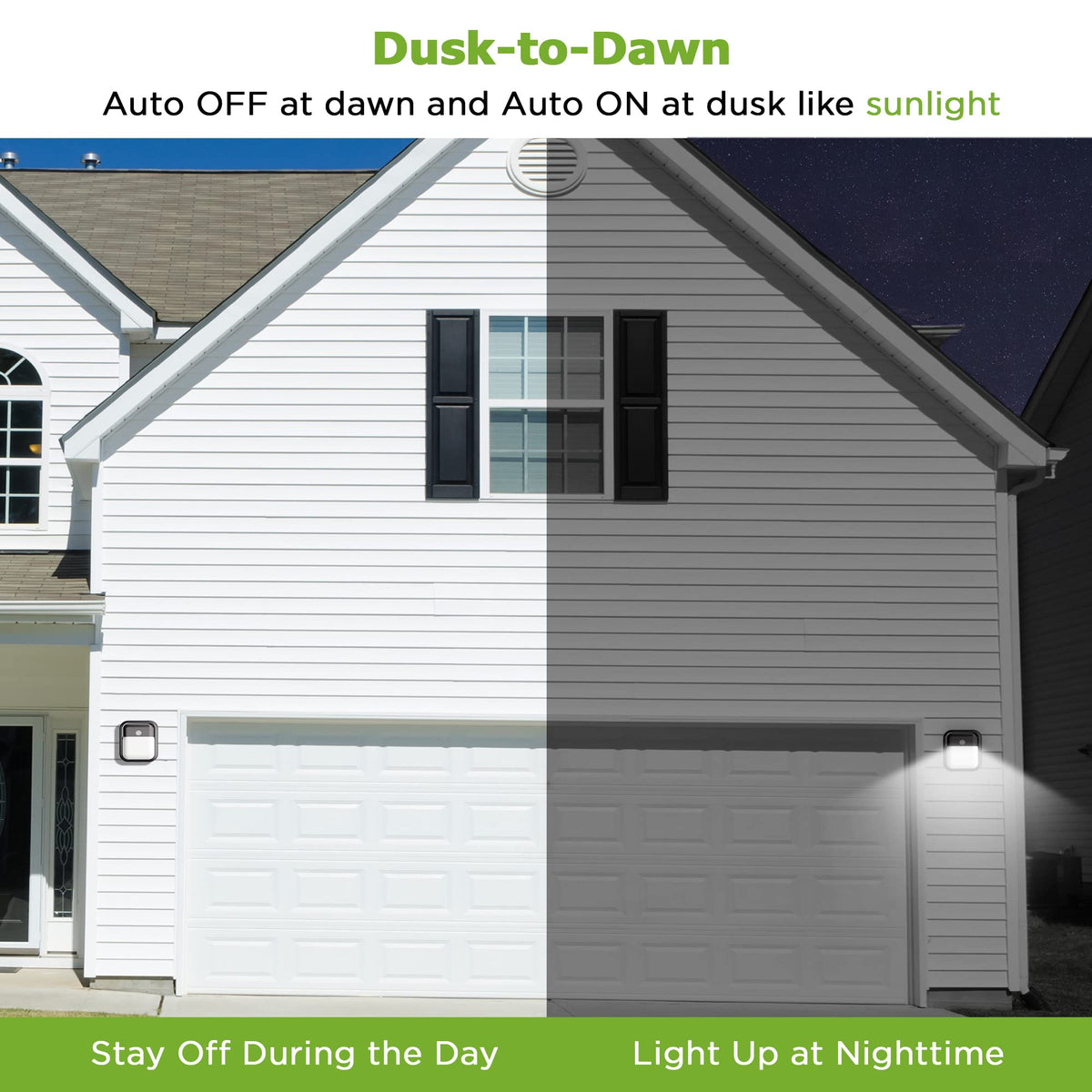 Q: How does the dusk to dawn photocell feature work?A: The dusk to dawn photocell technology automatically turns the light on at dusk and off at dawn, ensuring that your outdoor areas are well-lit without the need for manual operation.