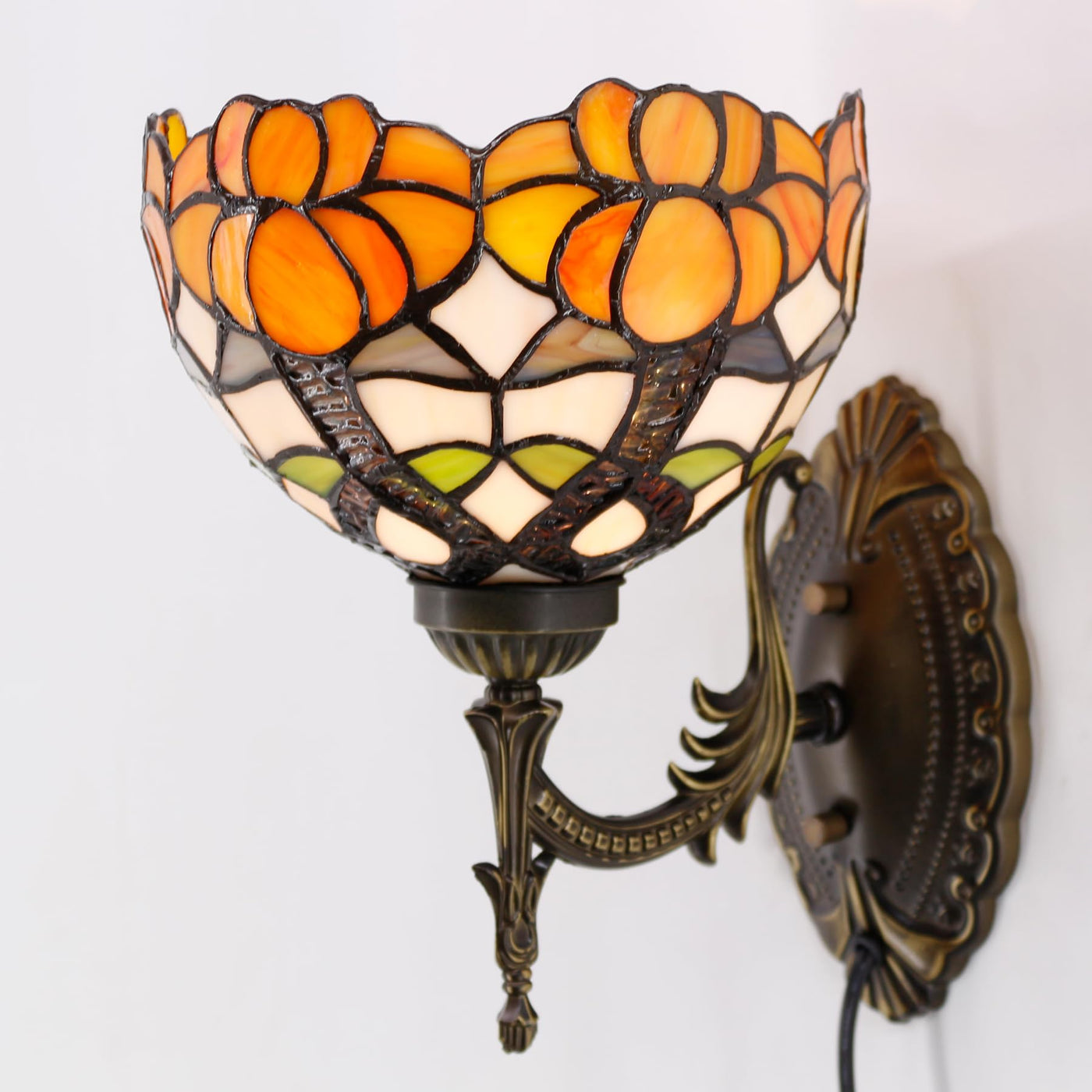 Tiffany Wall Sconces Lamp Plug In Stained Glass Wall Lighting 8X10.5X11 Inch Lamp Information: The lampshade width 8 inches (20 cm), Height 11 Inch (27 cm) ,10.5 Inch Far Away from Wall, Wire Length 67 Inch (170 CM) with switch on cord, simple assembly, Up or down light adjustable. Bulb Suggestion: All bulb base in E26 can be used, LED G45/A15/A19 bulb is better, Max 60 W; Warm light bulb can get more beautiful color light, 1 light, ( Bulb not included). Color of Glass: Stained glass is mix color, not uniform color , each two lamps will different in color. Oil on Surface: The new lampshade has been protected with mineral oil as part of the finishing process, Please use a soft dry cloth to remove any excess oil. Our Service: Any problem you meet, please let us know, We will settle the problem for you soon.