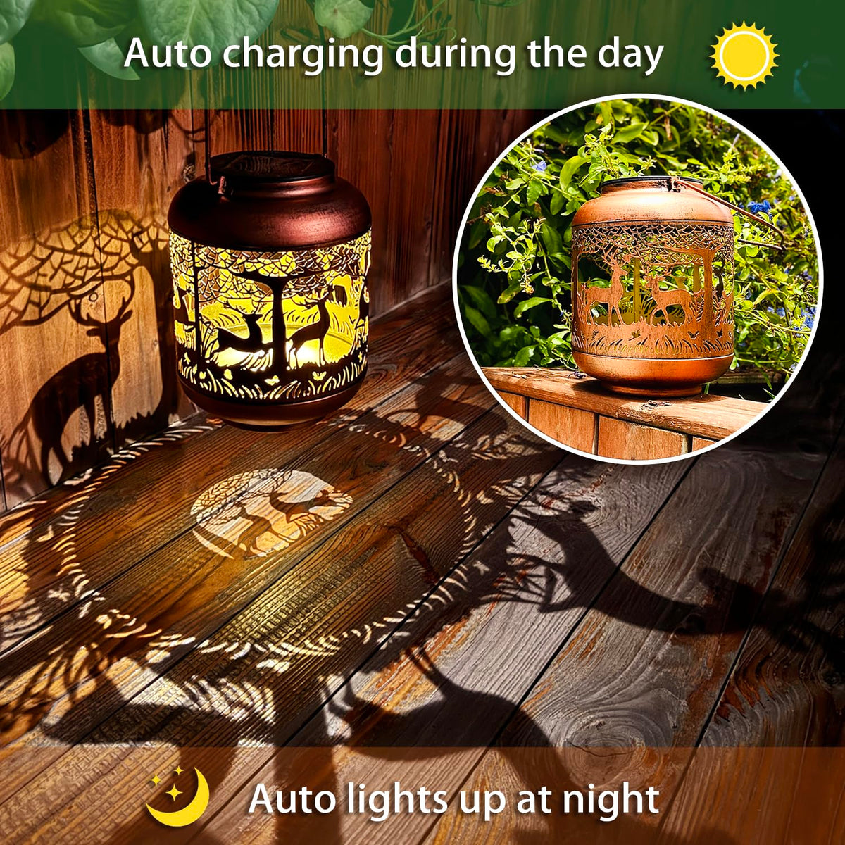 Efficient Solar Powered: The lantern absorbs sunlight for approximately 6 hours during the day, providing up to 8 hours of illumination at night. Featuring an automatic on/off function, it turns on at dusk and off at dawn, ensuring hassle-free operation.